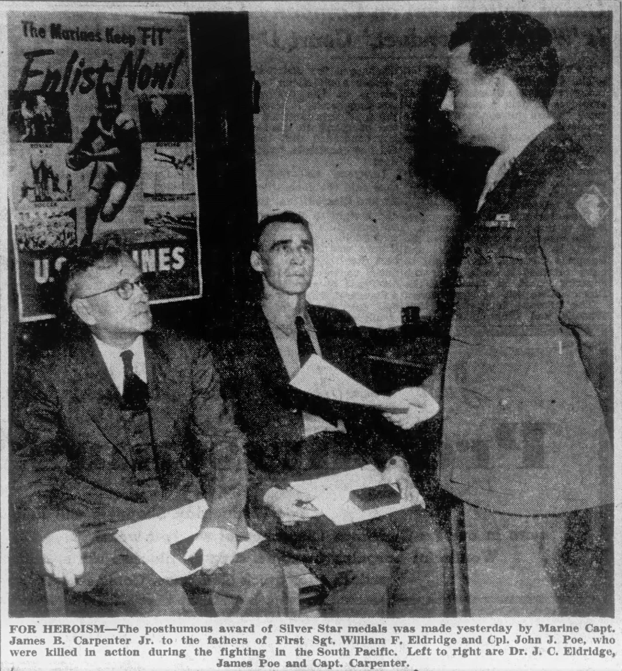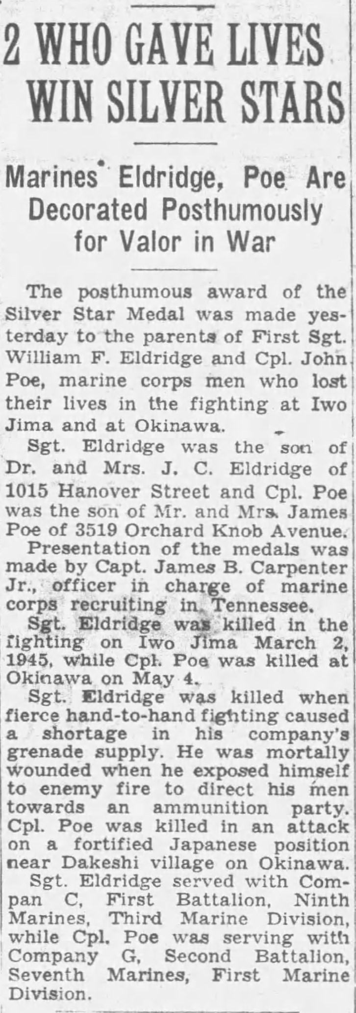 Sgt Eldridge was the son of Dr. and Mrs. J.C. Eldridge of 1015 Hanover Street and Cpl. Poe was the son of Mr. and Mrs. James Poe of 3519 Orchard Knob Avenue. Presentation of the medals was made by Capt. James B. Carpenter Jr., officer in charge of Marine Corps recruiting in Tennessee.
