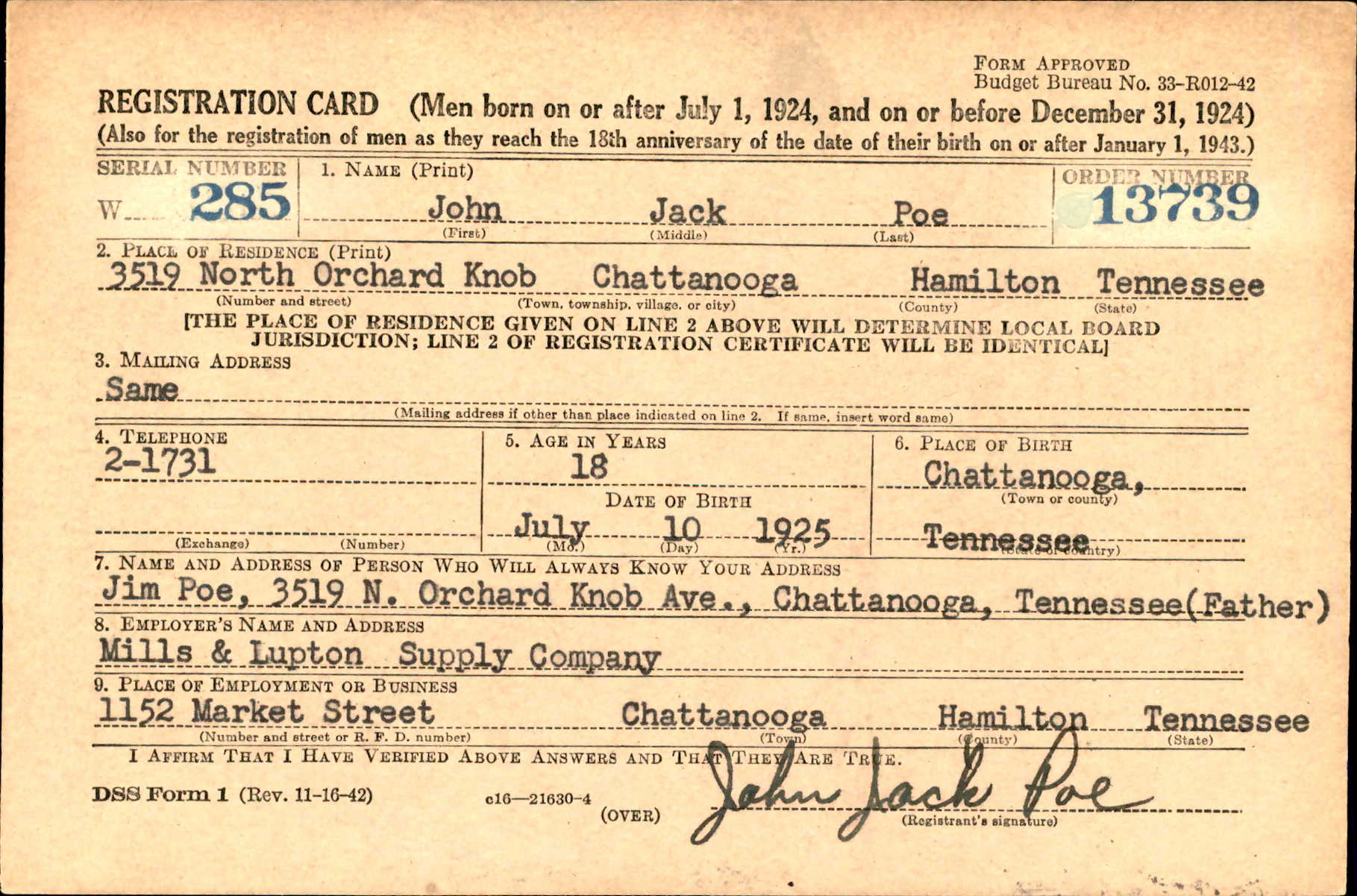 John Jack Poe was born in Chattanooga, Tennessee on 10 July 1925 to John James Poe and Mildred E Maxie.