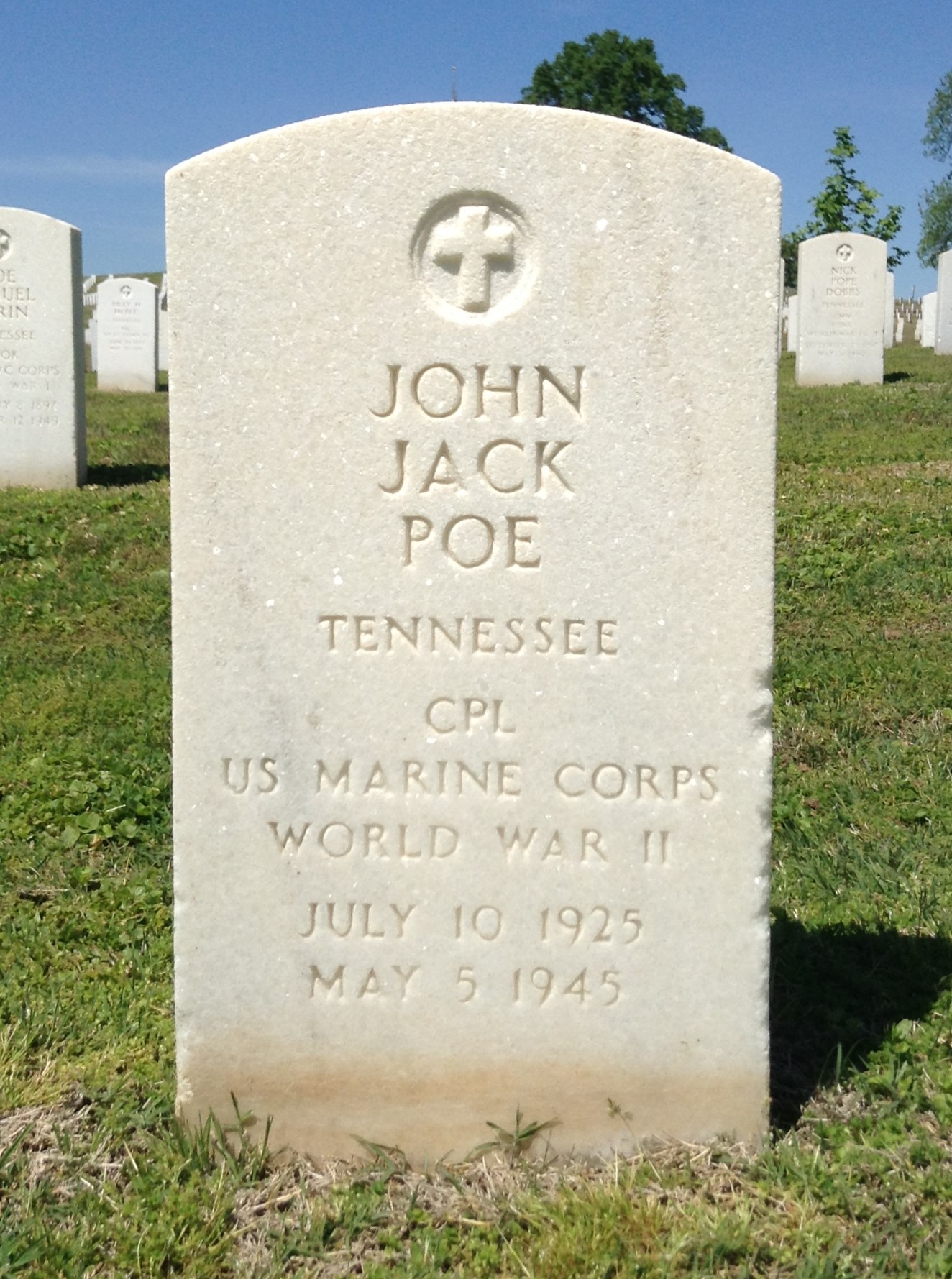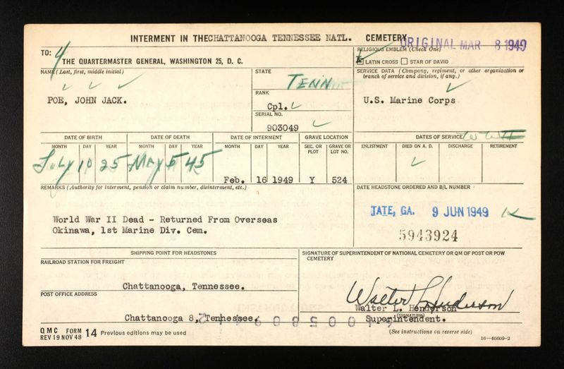 Cpl Poe was initially buried at Okinawa, 1st Marine Division Cemetery. Buried at Chattanooga National Cemetery, Y, 524.