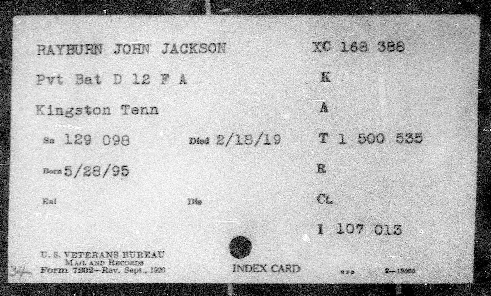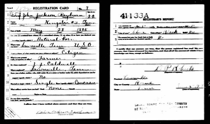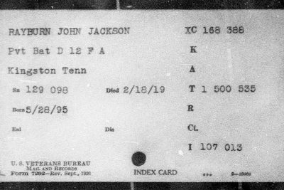 John Jackson Rayburn was born in Kingston, Tennessee on 28 May 1895 to John Smith Rayburn and Minerva Catherine Wheat.