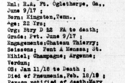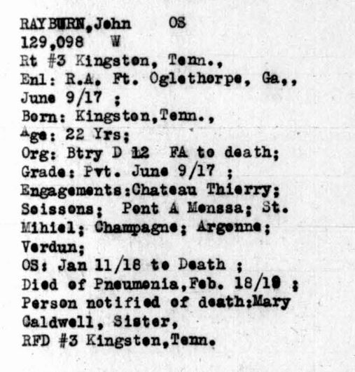 He was killed in action 18 February 1919 in France and is buried at Poplar Springs Cemetery, Roane County, Tennessee