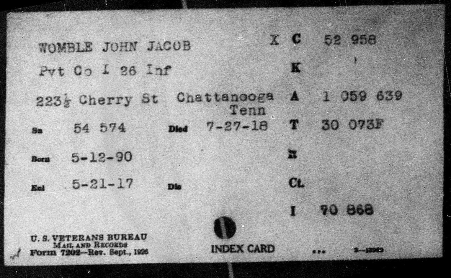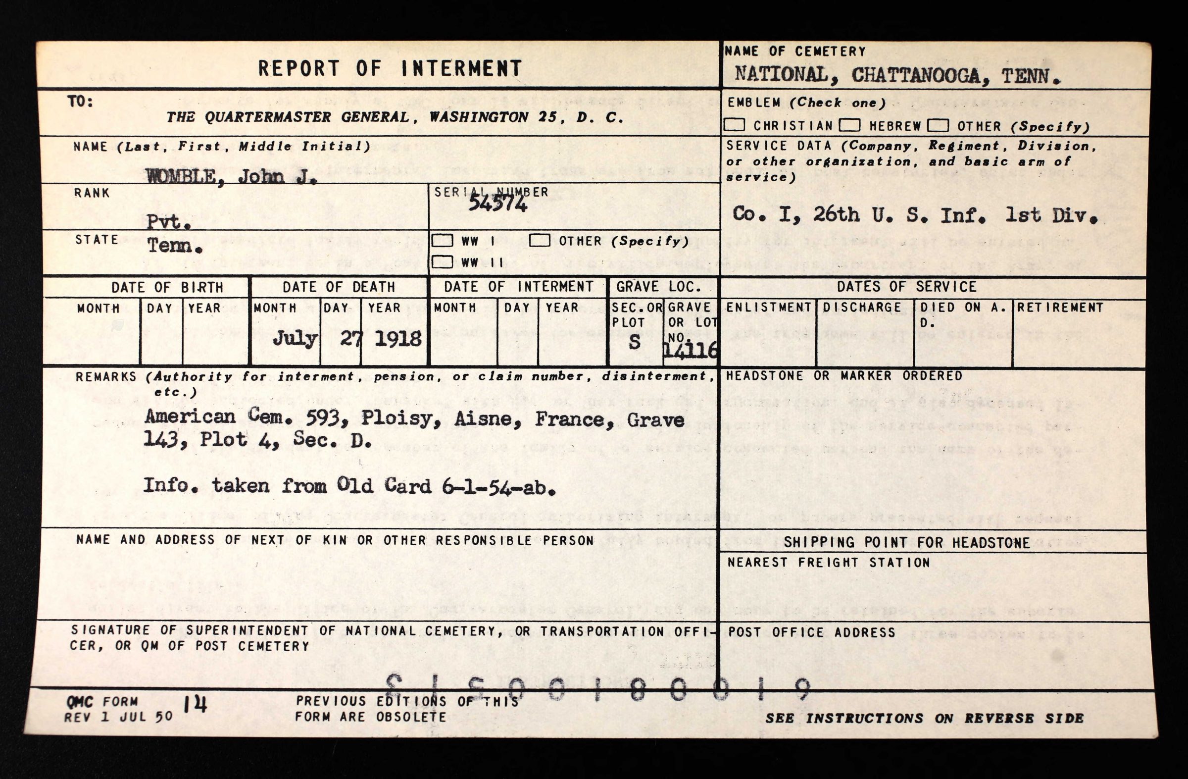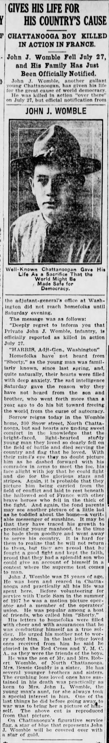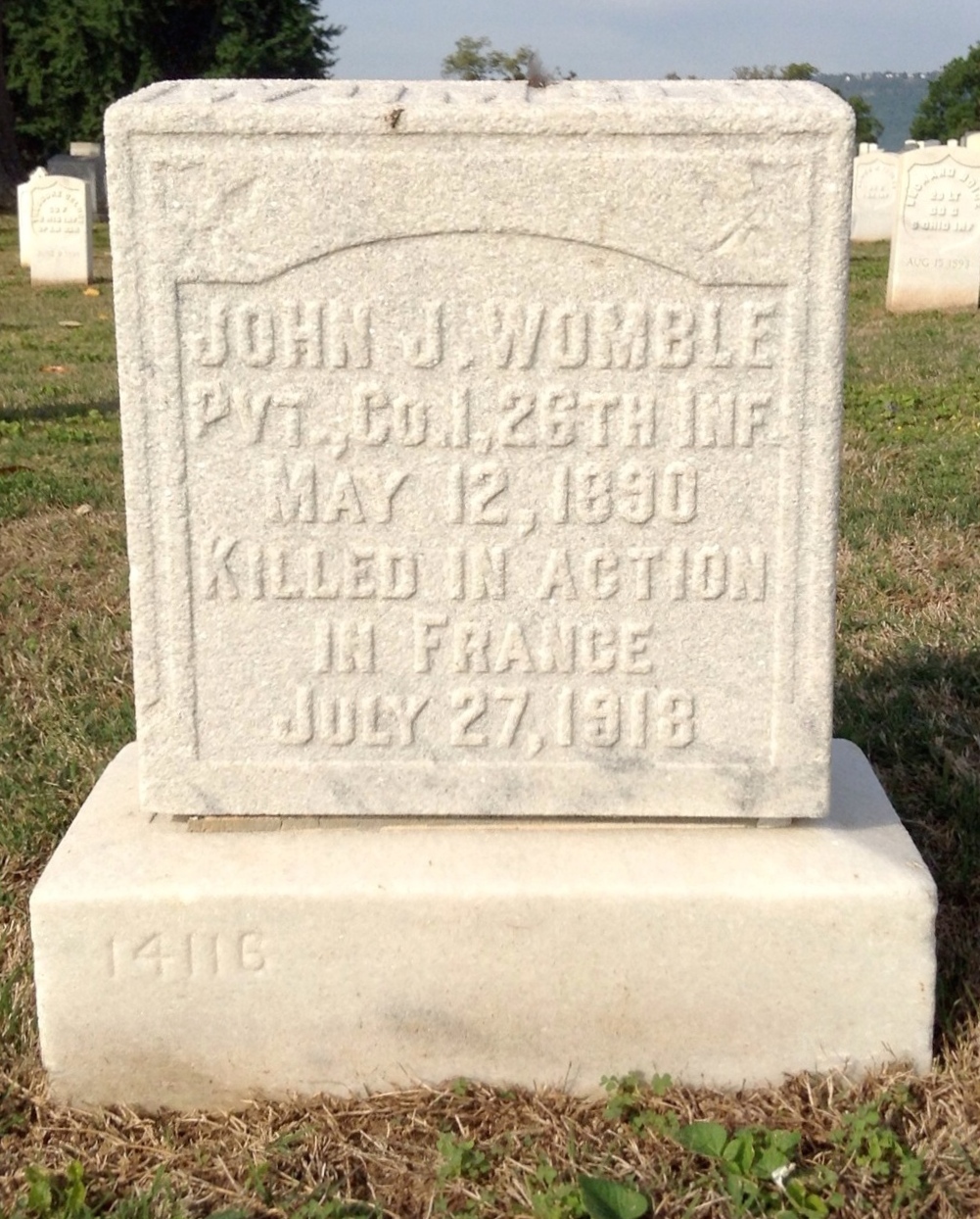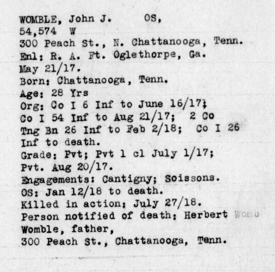 John J. Womble was born 12 May 1890 to W.H. Womble and Alice Mason. He entered the service May 12, 1917 at Chattanooga and received his training at Fort Oglethorpe in Georgia. He was killed in action at Soissons, France and initially buried at the American Cemetery 593, Ploisy, Aisne in France. He is buried at the Chattanooga National Cemetery, S, 14116.