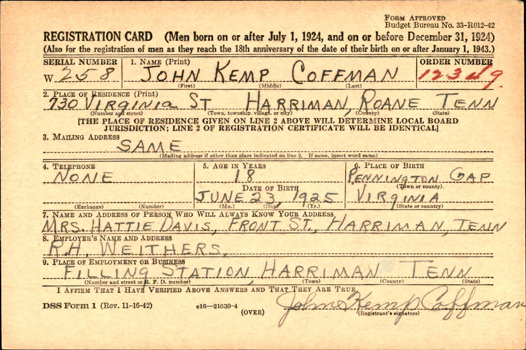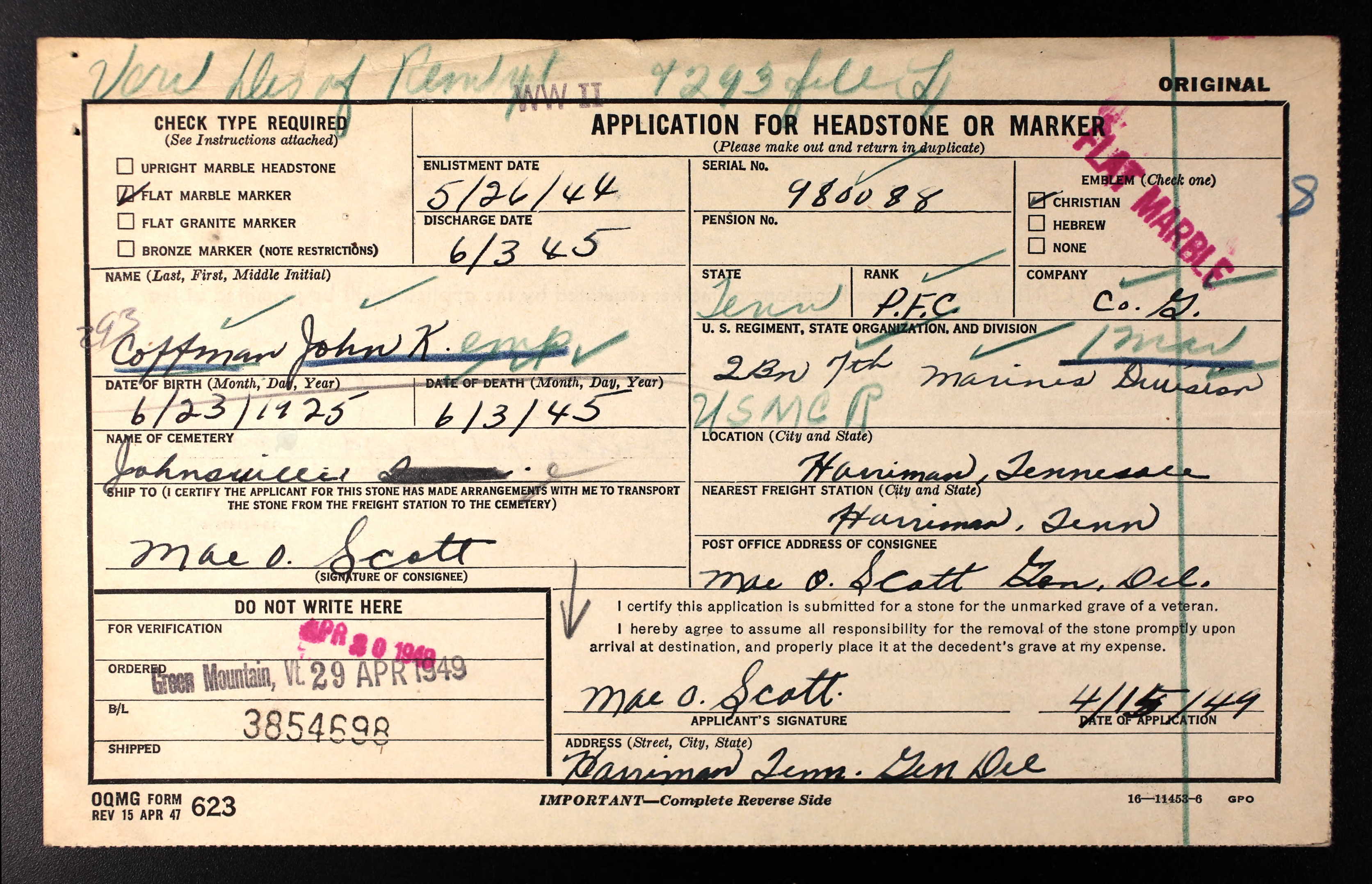 John Kemp Coffman was born in Pennington Gap, Tennessee. He was the son of Weaver Coffman and Ola Mae Hammonds. He was killed in action on Okinawa.