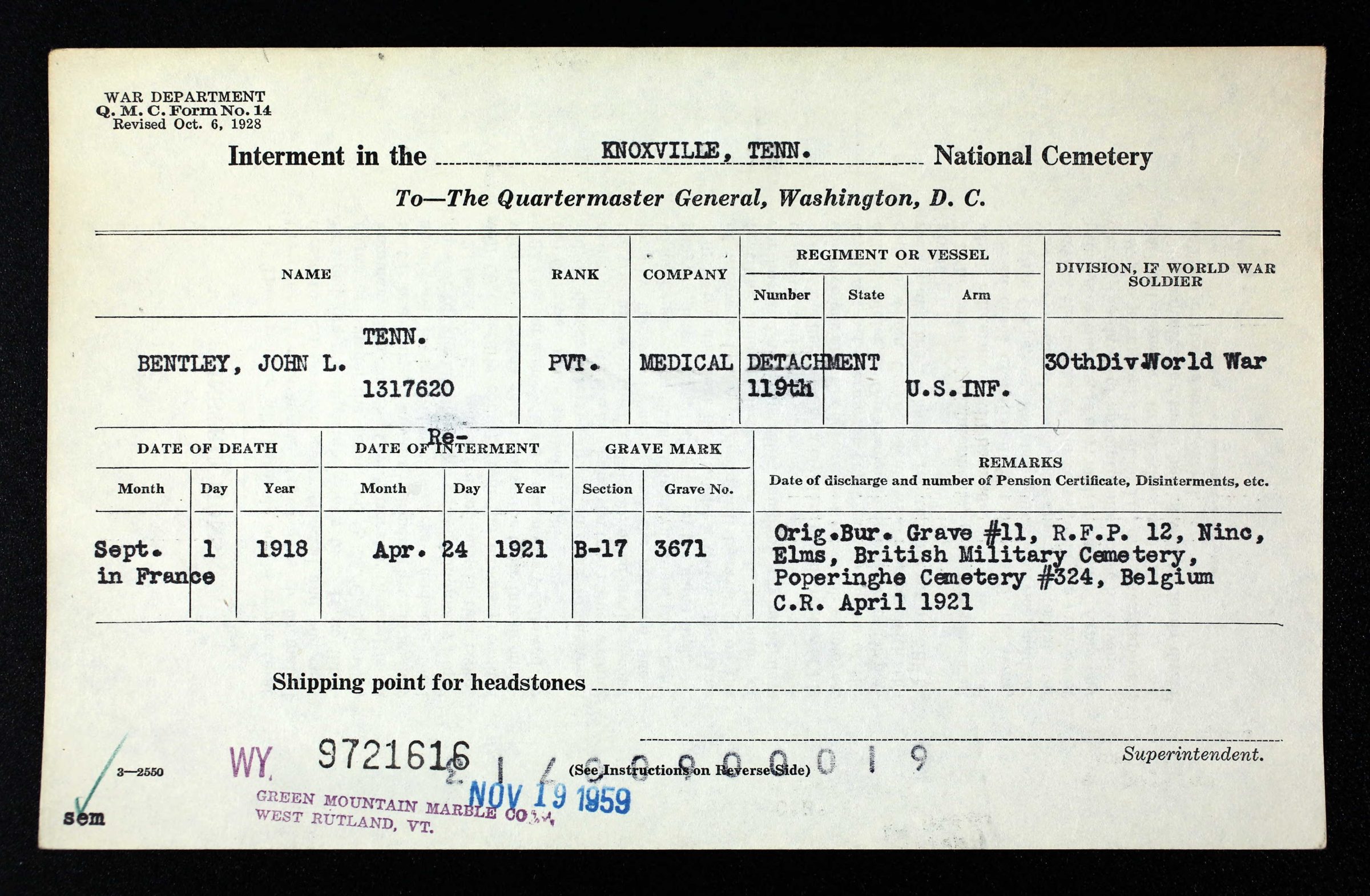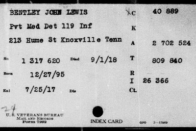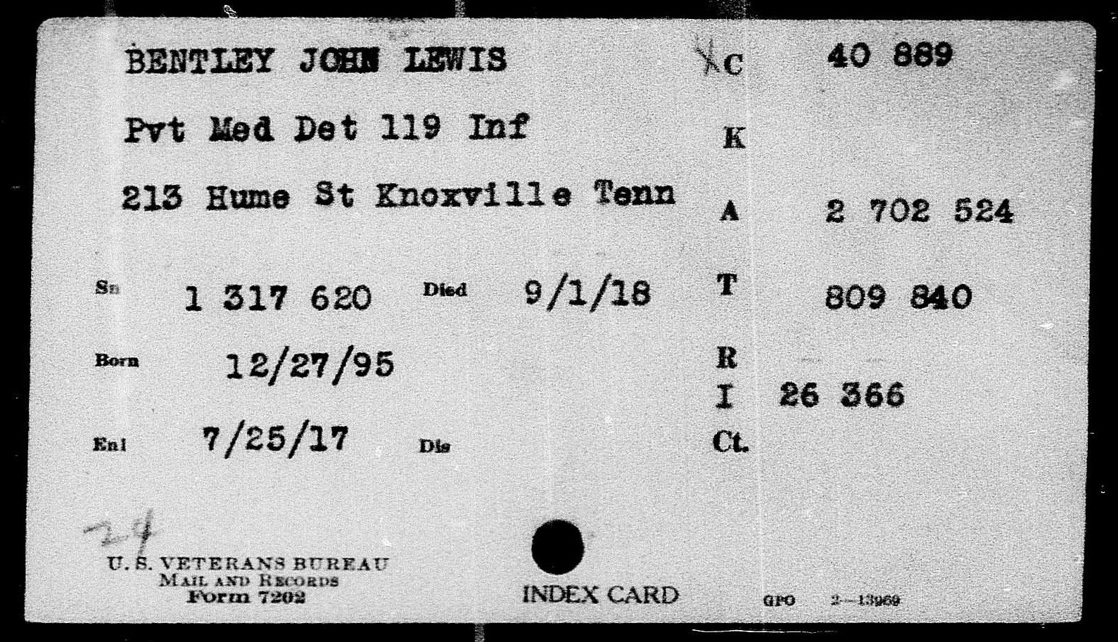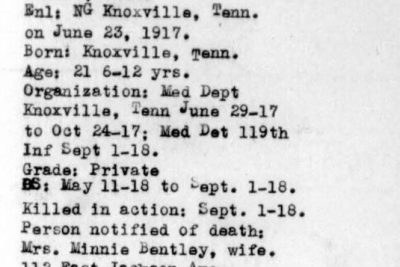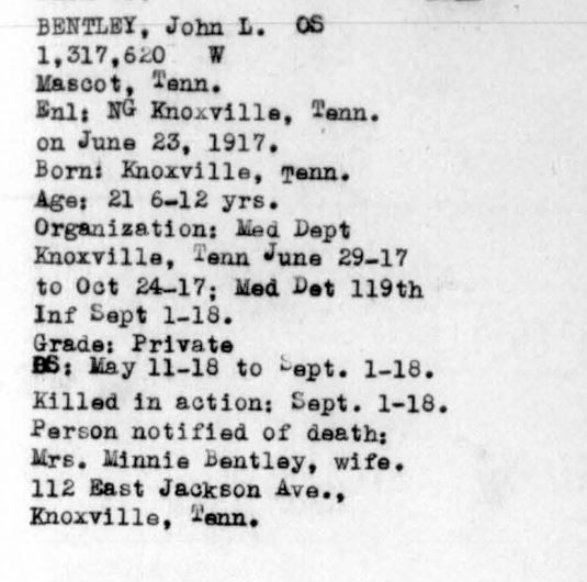 John L. Bentley, Knoxville man officially reported killed in action in France was a member of the medical department of the 119th Infantry Regiment. He formerly boarded at 112 East Jackson Avenue.