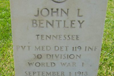 John L. Bentley, after enlisting in the medical detachment of the Second Tennessee Infantry in July, 1917, was transferred to the same branch of the 119th Infantry at Camp Sevier, SC. He sailed to France in May 1918, and went through the training period without accident. He lost his life in action September 1, 1918, in the operations in Belgium.