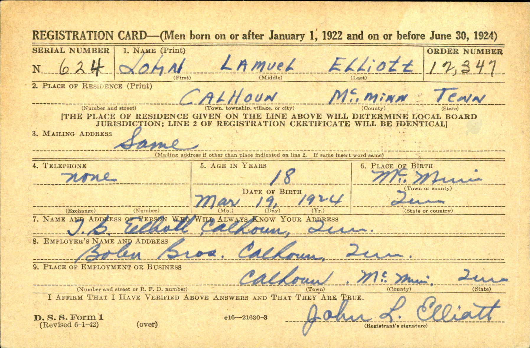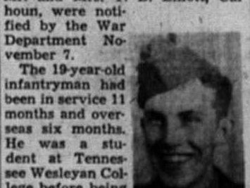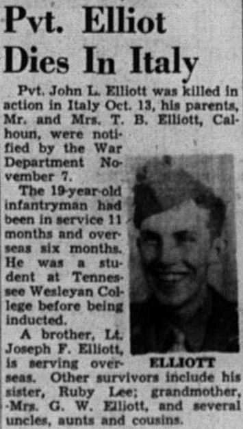 Pvt. John L. Elliott was killed in action in Italy Oct. 13, his parents, Mr. and Mrs. T.B. Elliott, Calhoun, were notified by the War Department November 7. The 19-year-old infantryman had been in service 11 months and overseas six months. He was a student at Tennessee Wesleyan College before being inducted. A brother, Lt. Joseph F. Elliott is serving overseas. Other survivors include his sister, Ruby lee; grandmother, Mrs. G.W. Elliott and several uncles, aunts and cousins.