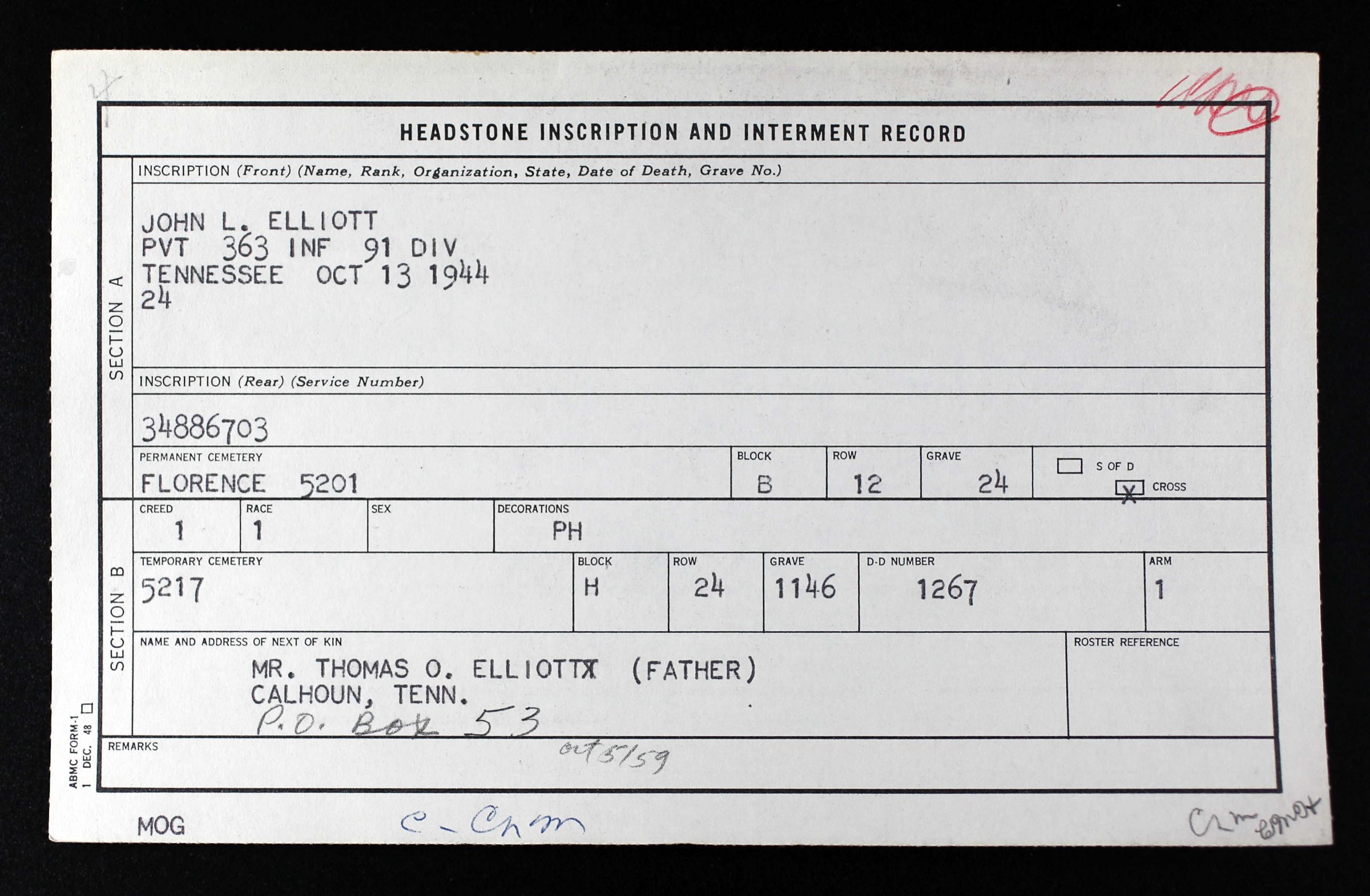 Private Elliott was killed in action on the 13th of October 1944. He is interred at the Florence American Cemetery, Florence, Italy, plot B, row 12, grave 24.