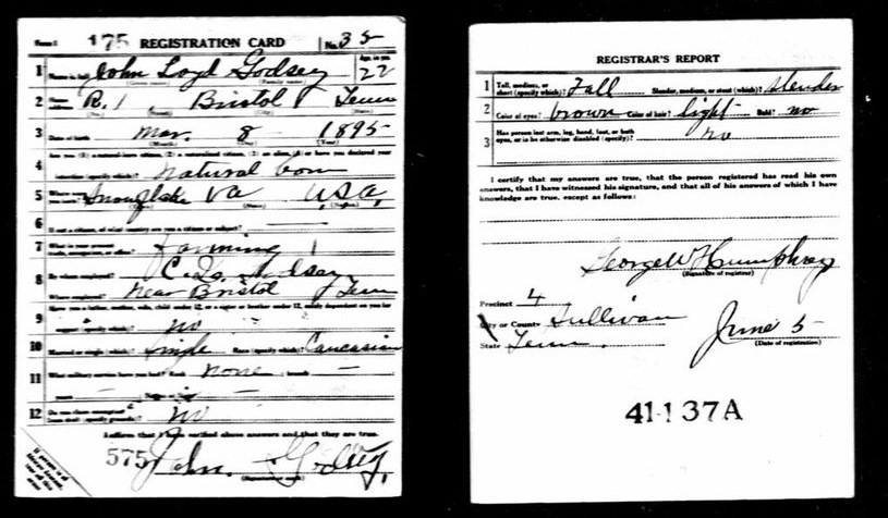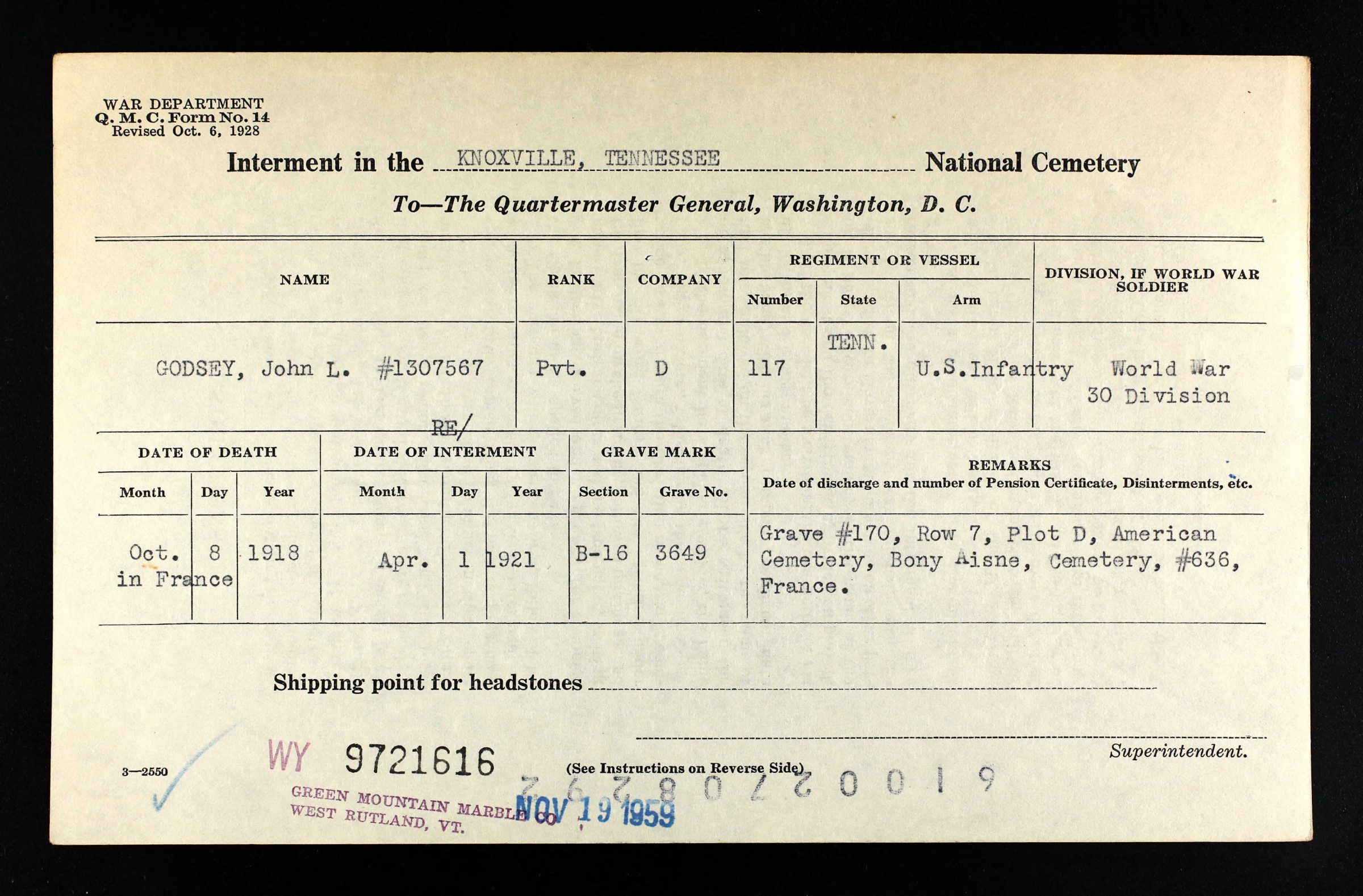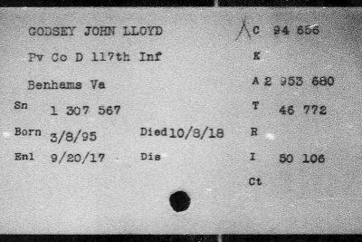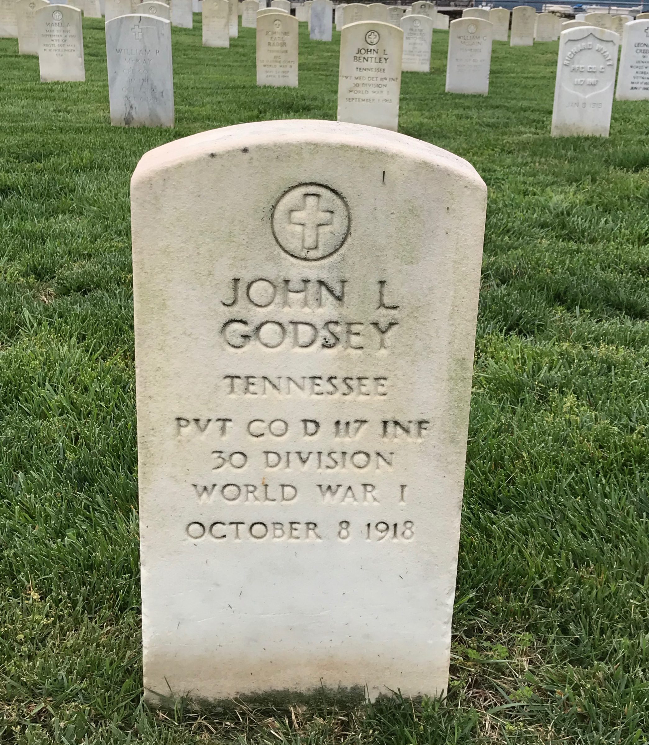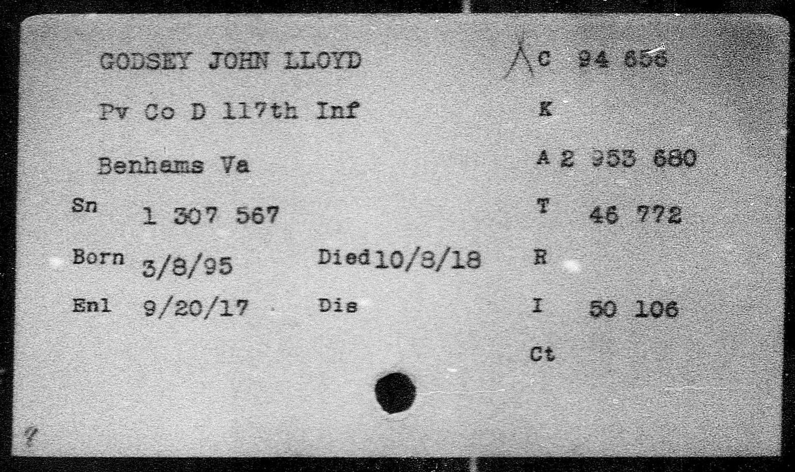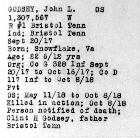 John Lloyd Godsey was born 8 March 1895 in Snowflake, Virginia to Clinton Hayes Godsey and Martha Emily Barker. He entered military service on 20 September 1917 at Shamble, Georgia. Pvt Godsey was killed in action in France and was initially buried at the American Cemetery, Bony, Aisne, France.