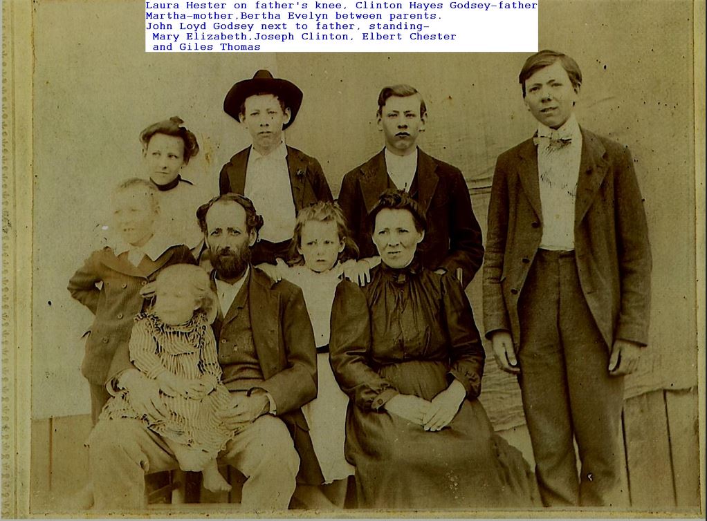 The Godsey Family circa 1904. Laura Hester on father’s knee. Clinton Hayes Godsey (father), Martha (mother), Bertha Evelyn between parents and John Loyd Godsey next to his father. Standing Mary Elizabeth, Joseph Clinton, Elbert Chester and Giles Thomas.