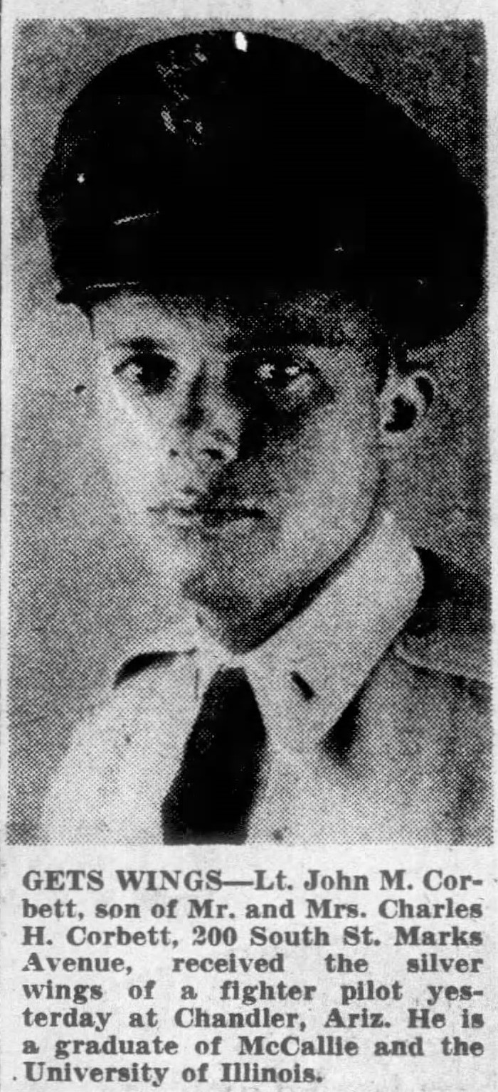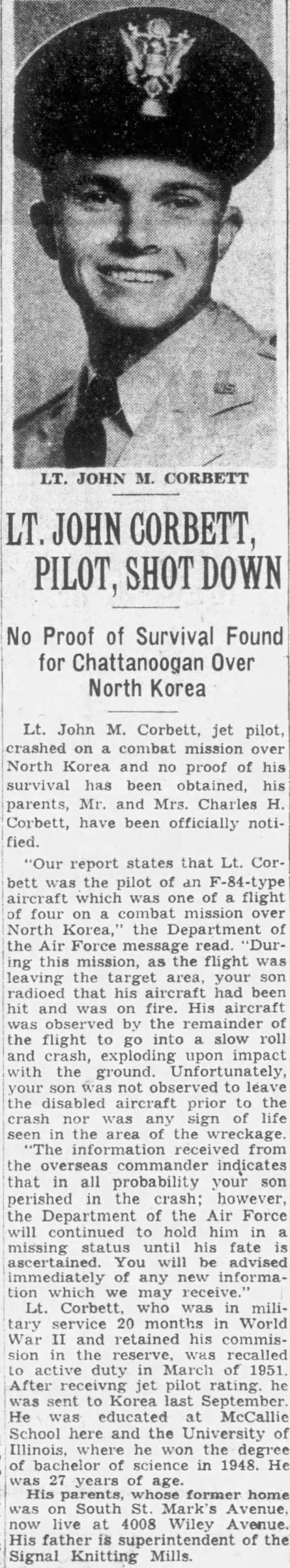 Lt. Corbett, who was in military service 20 months in World War II and retained his commission in the reserve, was recalled to active duty in March of 1951. After receiving jet pilot rating, he was sent to Korea last September. He was educated at McCallie School here and the University of Illinois, where he won the degree of bachelor of science in 1948. He was 27 years of age. His parents, whose former home was on South St. Mark’s Avenue, now live at 4008 Wiley Avenue. His father is superintendent of the Signal Knitting Mills.