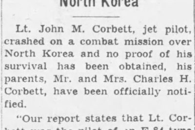 Lt. John M. Corbett, jet pilot, crashed on a combat mission over North Korea and no proof of his survival has been obtained, his parents, Mr. and Mrs. Charles H. Corbett, have been officially notified. “Our report statest hat Lt. Corbett was the pilot of an F-84-type aircraft which was one of a flight of four on a combat mission over North Korea,” the Department of the Air Force message read. “During this mission, as the flight was leaving the target area, your son radioed that his aircraft had been hit wand was on fire. His aircraft was observed by the remainder of the flight to go into a slow roll and crash, exploding upon impact with the ground. Unfortunately, your son was not observed to leave the disabled aircraft prior to the crash nor was any sign of life seen in the area of the wreckage. “The information received from the overseas commander indicates that in all probability your son perished in the crash; however, the Department of the Air Force will continue to hold him in a missing status until his fate is ascertained. You will be advised immediately of any new information which we may receive.”