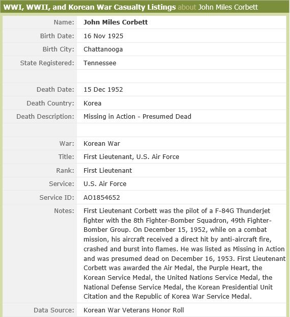 First Lieutenant Corbett was the pilot of a F-84G Thunderjet fighter with the 8th Fighter Bomber Squadron, 49th Fighter Bomber Group. On December 15, 1952, while on a combat mission, his aircraft received a direct hit by anti-aircraft fire, crashed and burst into flames. He was listed as Missing in Action and was presumed dead on December 16, 1953. His name is inscribed on the Courts of the Missing at the Honolulu Memorial.