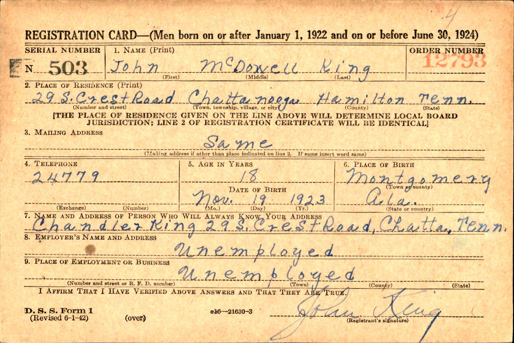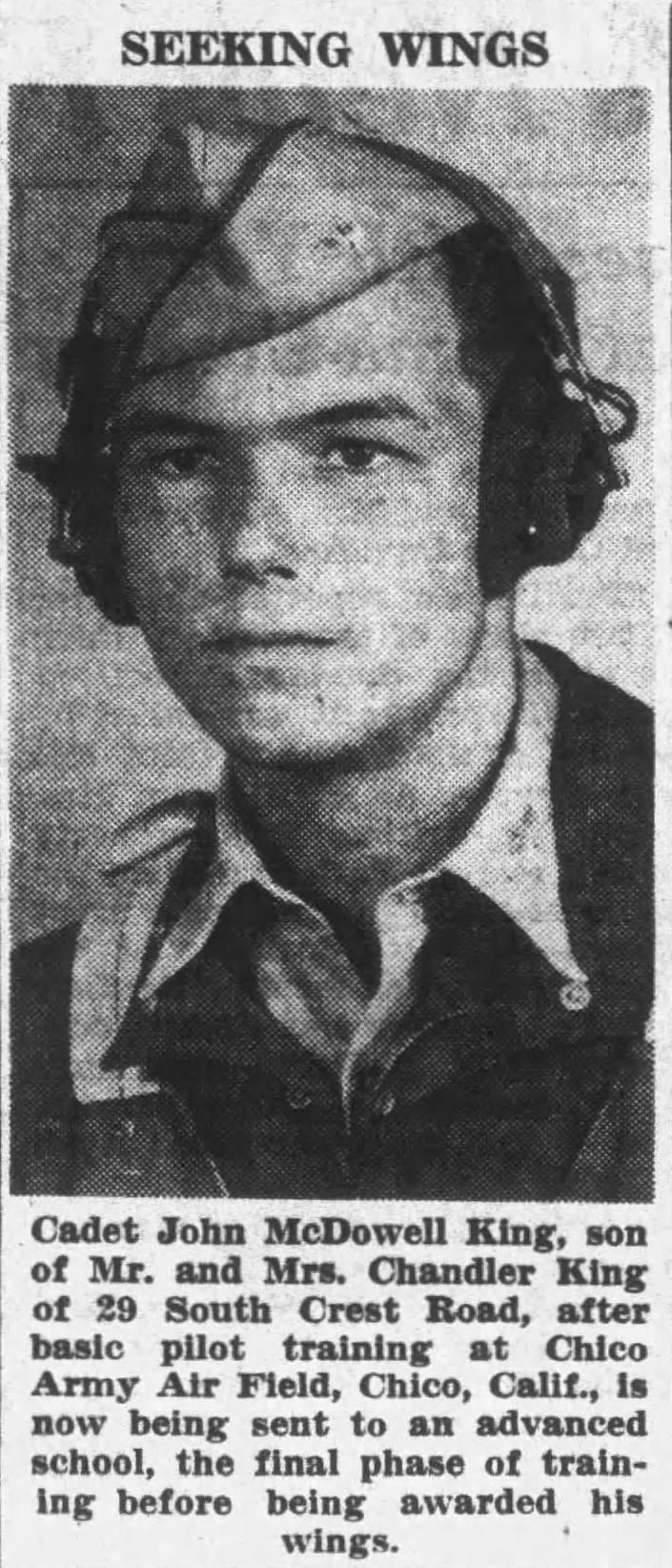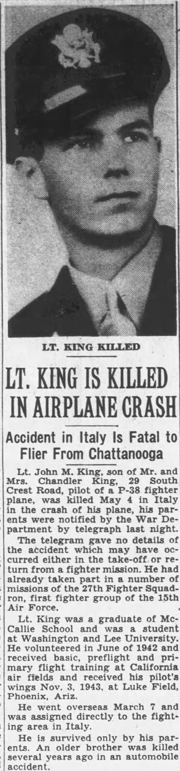 2nd Lt. John McDowell King was born Montgomery, Alabama, the son of Chandler King and Virginia McDowell. He had one brother, Chandler King Jr. who was killed in an automobile accident in 1940. John King was a graduate of McCallie School. He enrolled at Washington and Lee University, Lexington, Va., in 1941 and was a member of Phi Delta Theta Fraternity. He received basic pilot training at Chico Army Air Field in Chico, California and advanced pilot training at Luke Field, Arizona. He went overseas March 7 and was assigned directly to the fighting area in Italy.