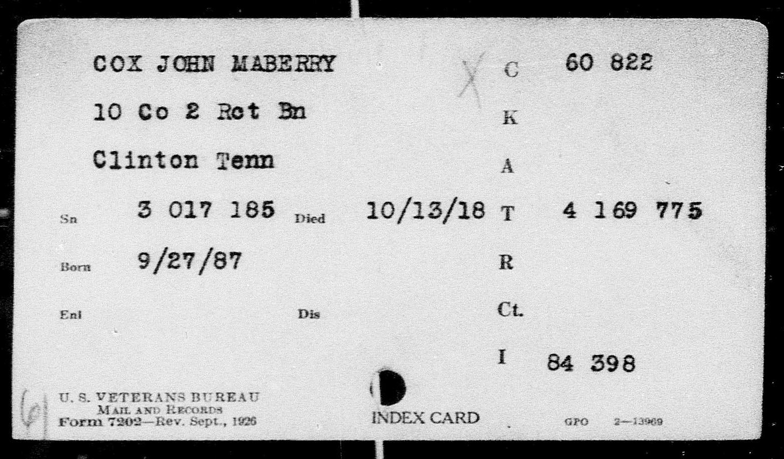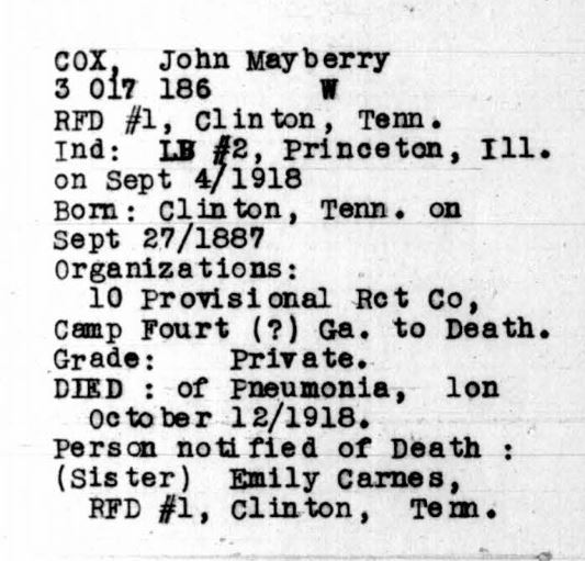 - Burial/Memorial Location: Cox Cemetery, Anderson County, TN