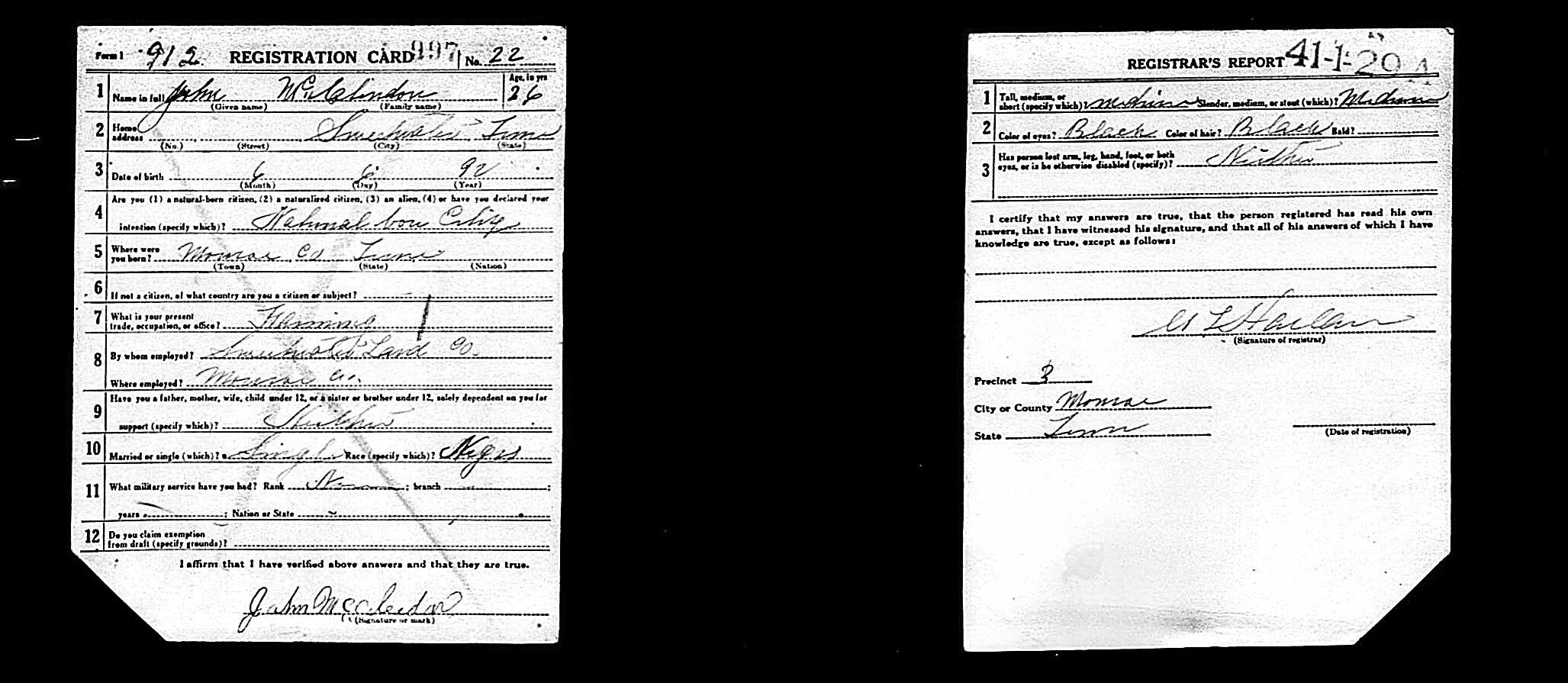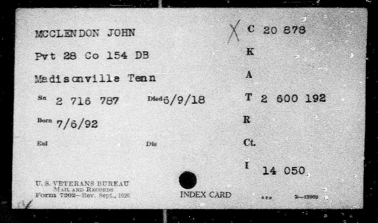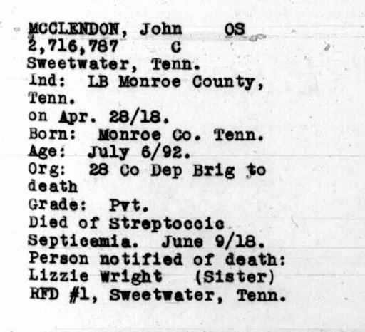 John McClendon was a farmer before he entered the service. He died overseas of streptoccic and is buried at Park City Cem., Monroe Co., Tn