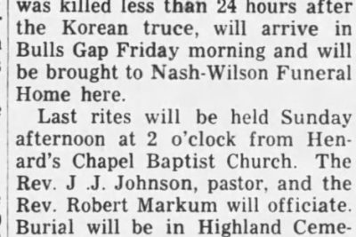 The body of a young Rogersville soldier, Cpl. John N. Freeman, who was killed less than 24 hours after the Korean truce, will arrive in Bulls Gap and will be brought to Nash-Wilson Funeral Home. Last rites will be held from Henard’s Baptist Church. Burial will be in Highland Cemetery.