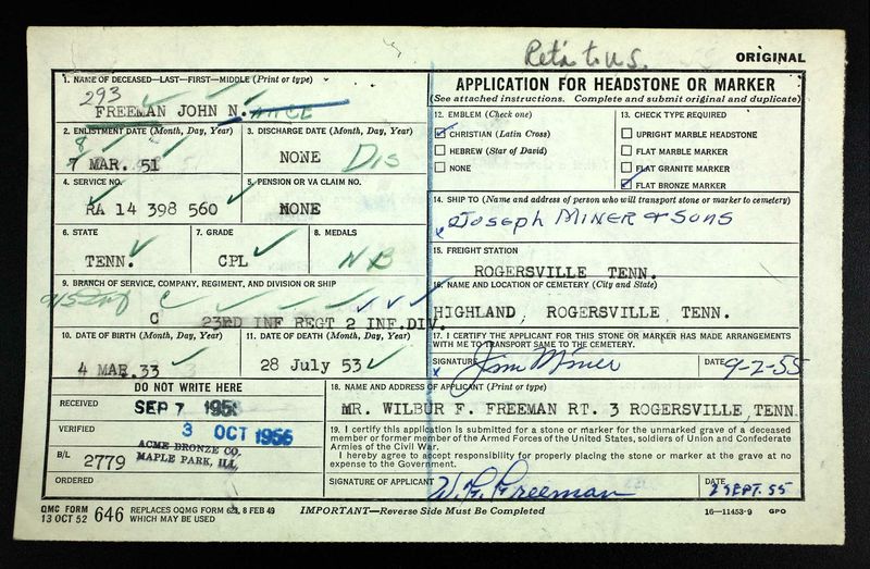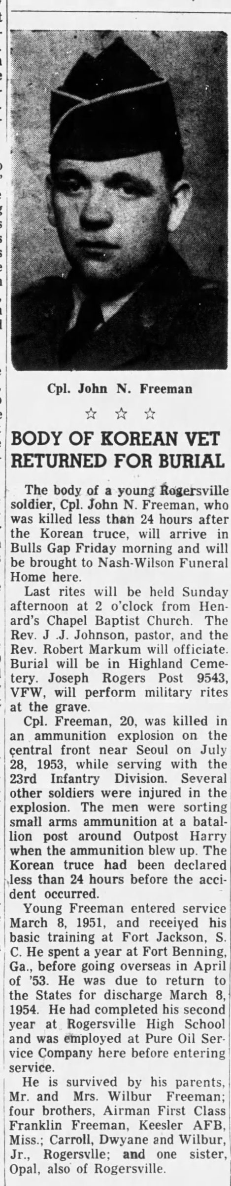 Cpl. Freeman, 20, was killed in an ammunition explosion on the central front near Seoul on July 28, 1953, while serving with the 23rd Infantry Division. Several other soldiers were injured in the explosion. The men were sorting small arms ammunition at a battalion post around Outpost Harry when the ammunition blew up. The Korean truce had been declared less than 24 hours before the accident occured. Young Freeman entered service March 8, 1951 and received his basic training at Fort Jackson, S.C. He spent a year at Fort Benning, Ga., before going overseas in April of ’53. He was due to return to the States for discharge March 8, 1954. He had completed his second year at Rogersville High School and was employed at Pure Oil Service Company here before entering service. He is survived by his parents, Mr. and Mrs. Wilbur Freeman; four brothers, Airman First Class Franklin Freeman, Keesler AFB, Miss.; Carroll, Dwyane and Wilbur Jr., Rogersville; and one sister, Opal, also of Rogersville.