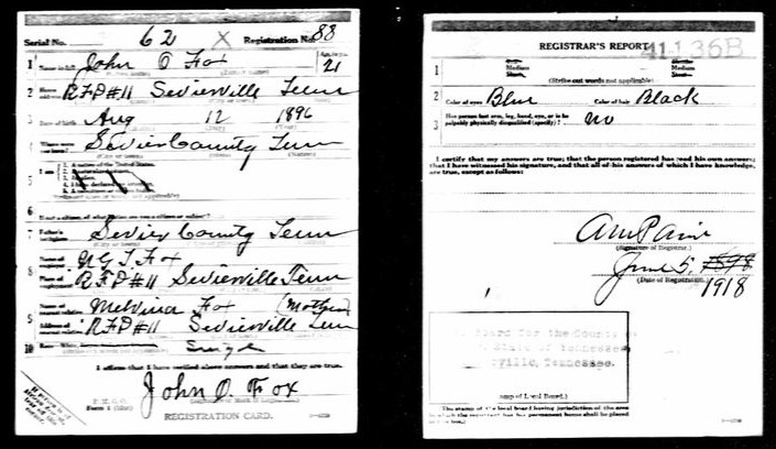 John Ollis Fox was born 12 August 1896, Sevier County, Tennessee, son of Nathaniel Grant Taylor Fox and Mahala Melvina Burchfield. He trained at Camp Wadsworth and Camp Merritt and sailed to Europe September 27, 1918 arriving there in October 1918. He served with the 57th Pioneer Infantry Regiment, Company M and died of broncho pneumonia in Brest, France.