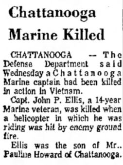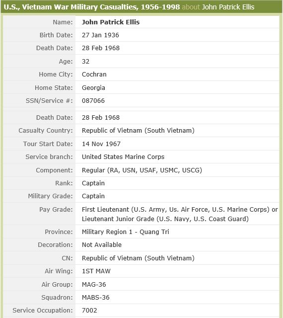 Captain John Patrick Ellis was born on January 27, 1936, and was originally from Cochran, Georgia. He served his country in the viet War as a 14-year veteran of the United States Marine Corps in MABS-36, MAG-36, 1ST MAW. His tour in Vietnam began on November 14, 1967. On February 28, 1968, Capt. Ellis was aboard a CH-46D helicopter of HMM-262 was struck by automatic weapons fire over Quang Tri, South Vietnam, while inbound to Khe Sanh on a recovery mission. The aircraft was downed by the enemy fire and exploded on impact, killing all 22 men aboard. Capt. Ellis is buried at Andersonville National Cemetery, in Andersonville, Sumter County, Georgia. The following are tributes left for Capt. Ellis: