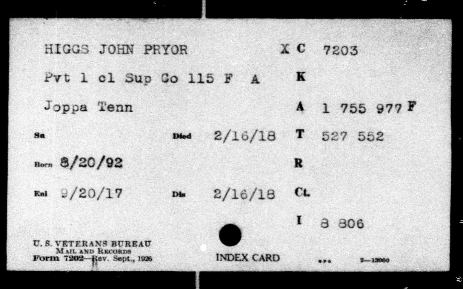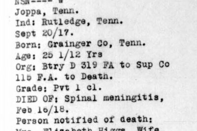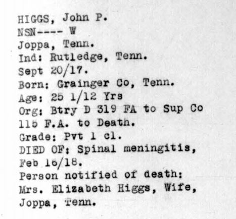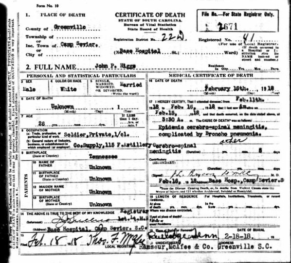 He died 16 February 1918 of meningitis at Camp Sevier, Greenville, South Carolina.