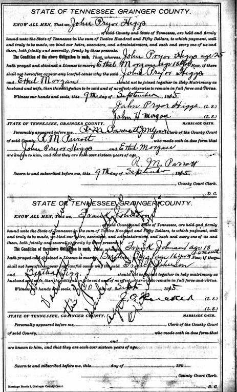 John Pryor Higgs was born 5 August 1892, Joppa, Grainger County, Tennnessee, husband of Eliza Morgan and father of Paralee Higgs.