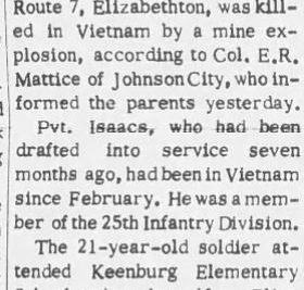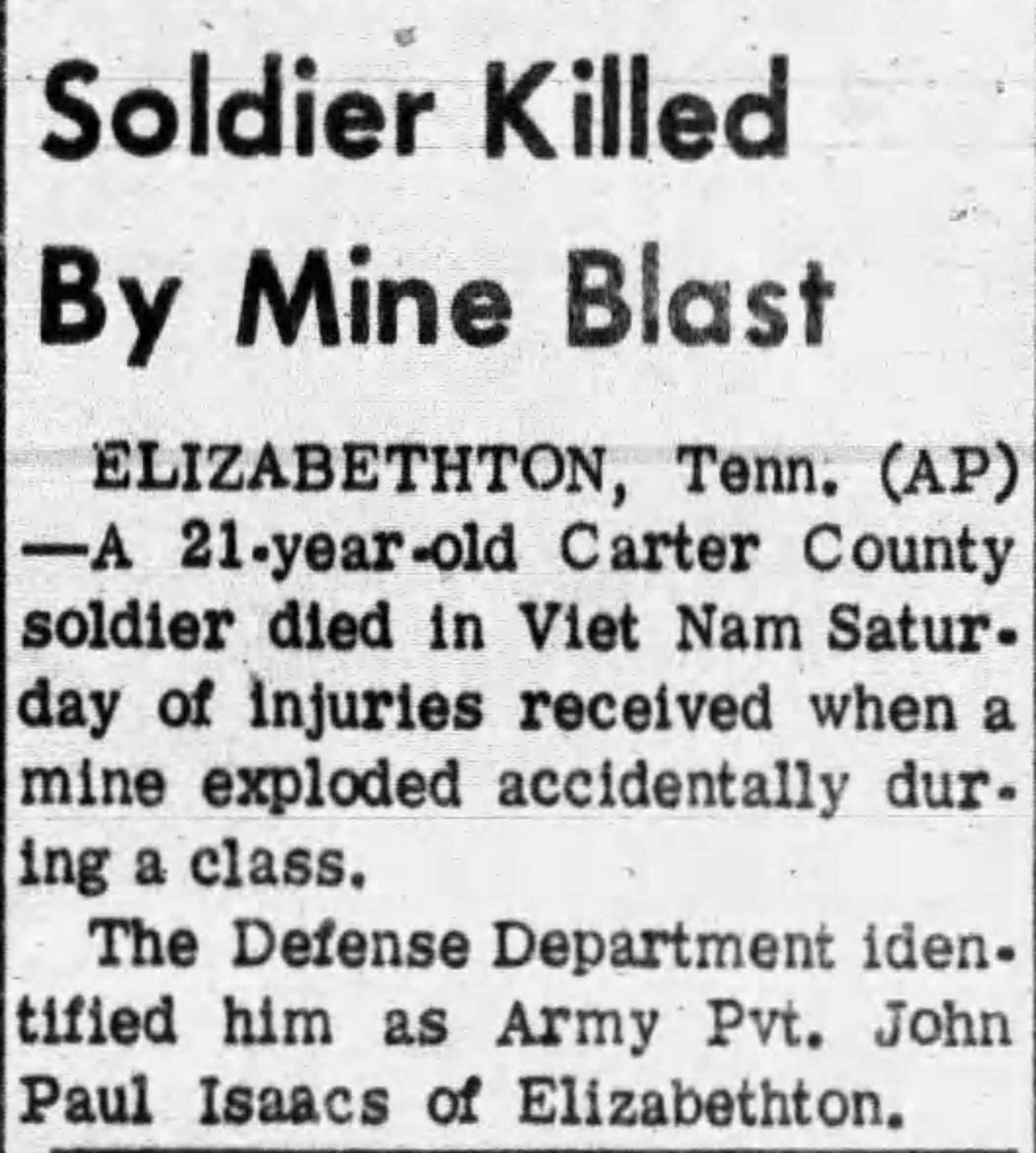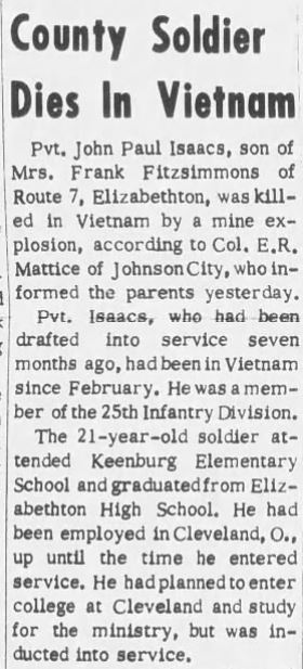 Pvt. John Paul Isaacs, son of Mrs. Frank Fitzsimmons of Route 7, Elizabethton, was killed in Vietnam by a mine explosion, according to Col. E.R. Mattice of Johnson City, who informed the parents yesterday. Pvt. Isaacs, who had been drafted into service seven months ago, had been in Vietnam since February. He was a member of the 25th Infantry Division. The 21-yearold soldier attended Keenburg Elementary School and graduated from Elizabethton High School. He had been employed in Cleveland, Ohio, up until the time he entered service. He had planned to enter college at Cleveland and study for the ministry, but was inducted into service. Survivors are the mother and step-father, Mr. and Mrs. Frank L. Fitzsimmons. Two brothers, Robert L. Isaacs of Elizabethton and Frank L. Fitzsimmons of the home; two sisters, Mrs. Allen D. Renfro, Georgetown, Pennsylvania and Debra Jane Fitzsimmons of the one; one grandmother, Mrs. Cora Bristol of Longview, Washington.