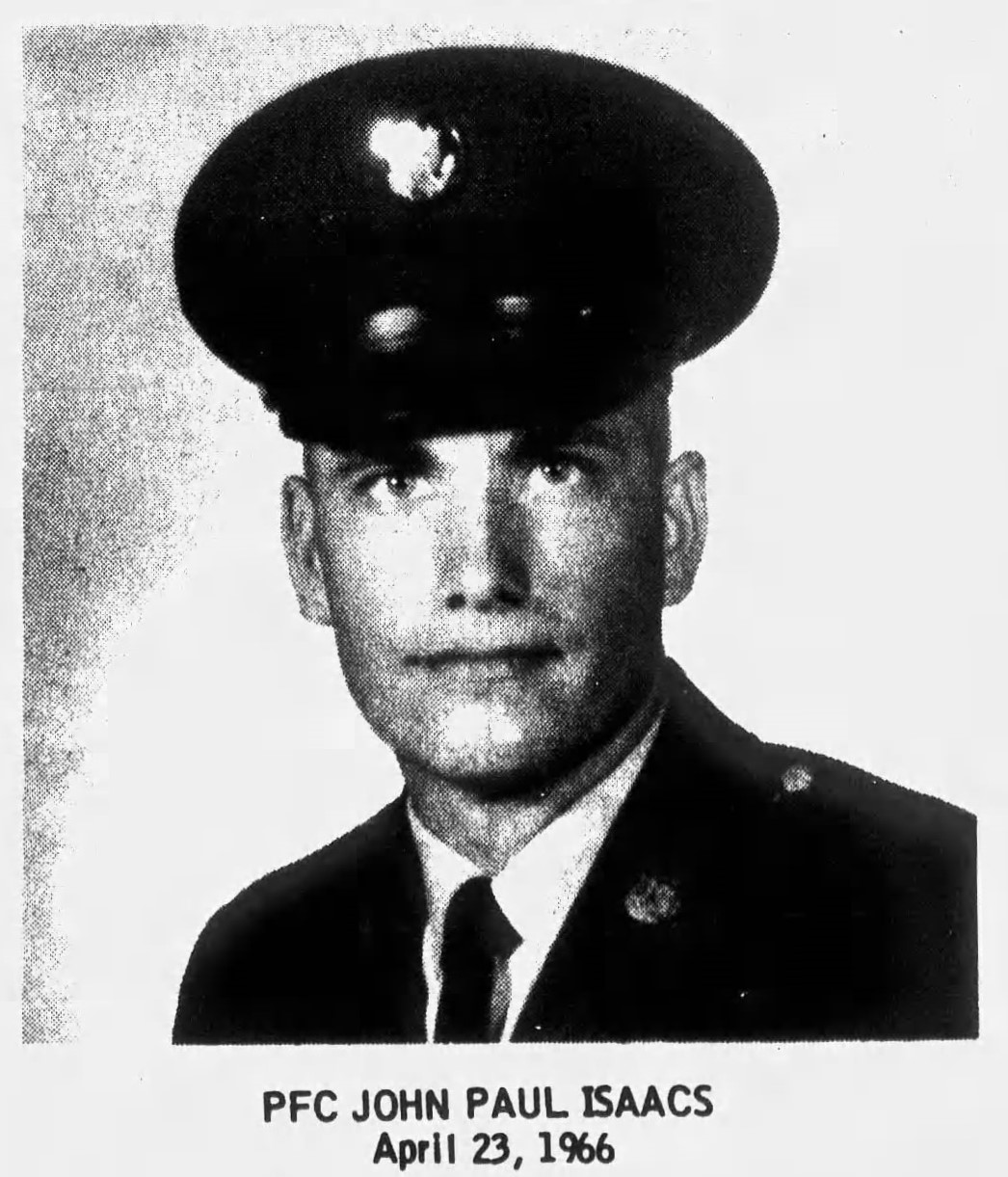 Private First Class John Paul Isaacs was born on October 14, 1944, and was originally from Cleveland, Ohio. He served his country in the Vietnam War in the United States Army, as an infantryman in B Company, 1st Battalion, 5th Infantry Regiment, 25th Infantry Division. His tour in Vietnam began on January 8, 1966. A few months later, on April 23, 1966, PFC Isaacs was killed under accidental, non-hostile conditions in Hau Nghia province, South Vietnam; he was 21 at the time of his death. PFC Isaacs is memorialized on the Vietnam Veterans Memorial on Panel 6E, Line 130.