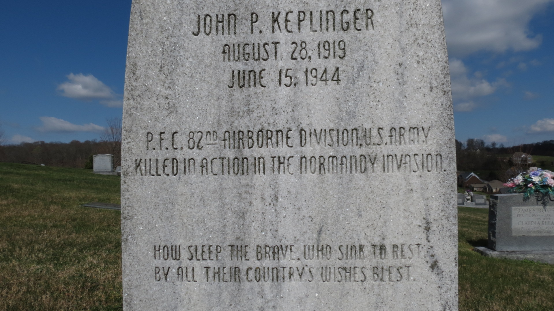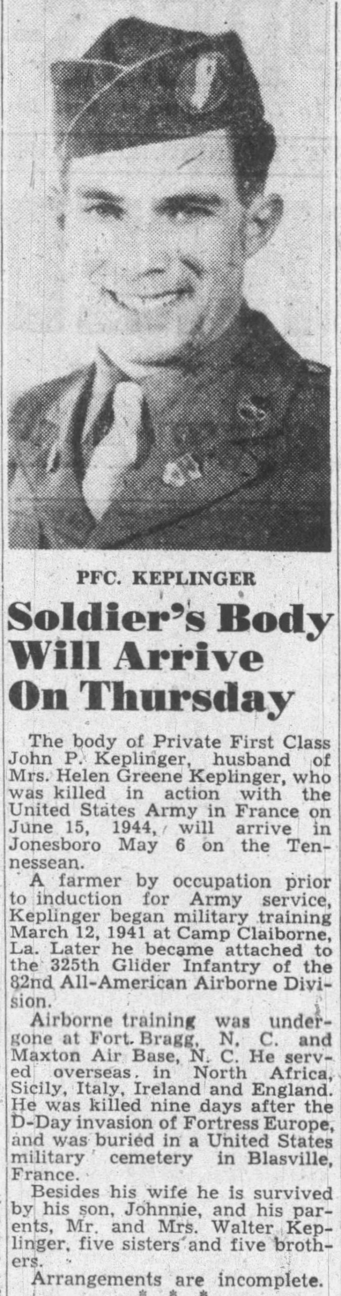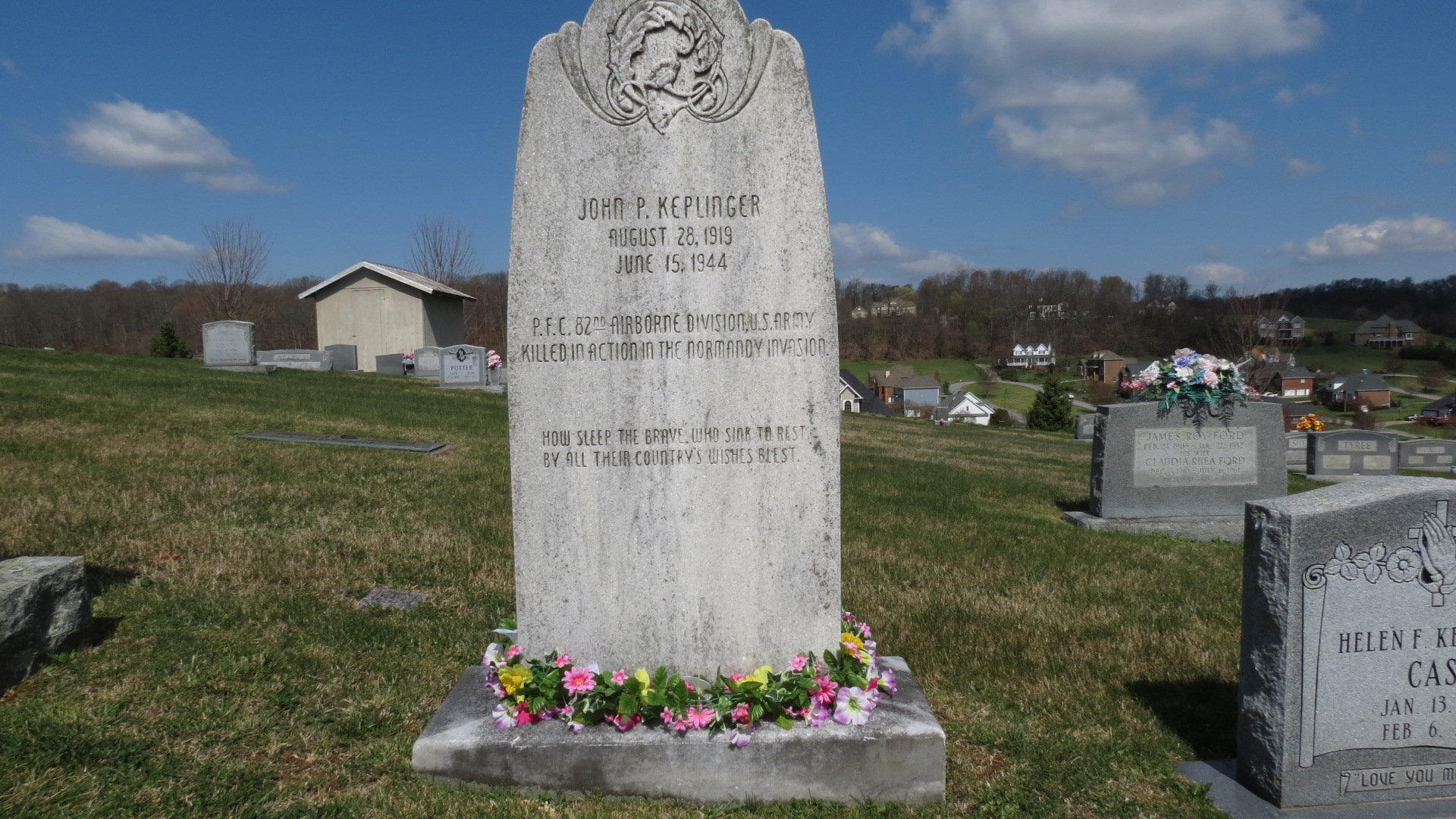John’s combat glider drop would come on 7 June 1944 during Operation Overlord the day after the invasion began in the vicinity of St. Mere Eglise to reinforce the Parachute Regiments that dropped in the morning before on D-Day. Eight days later on 15 June, John was killed in action while engaged with the enemy near St. Sauveur le Vicomte, Normandy, France. He was 24 years old and was interred at the United States Military Cemetery at Blosville, France. After the war, he was disinterred and moved to the Highland Church of Christ Cemetery, Jonesborough, Tennessee. John participated in four unit campaigns Tunisia, Sicily, Naples-Foggia and Normandy. For his actions, he was awarded the Purple Heart.