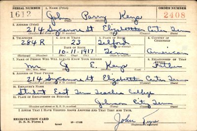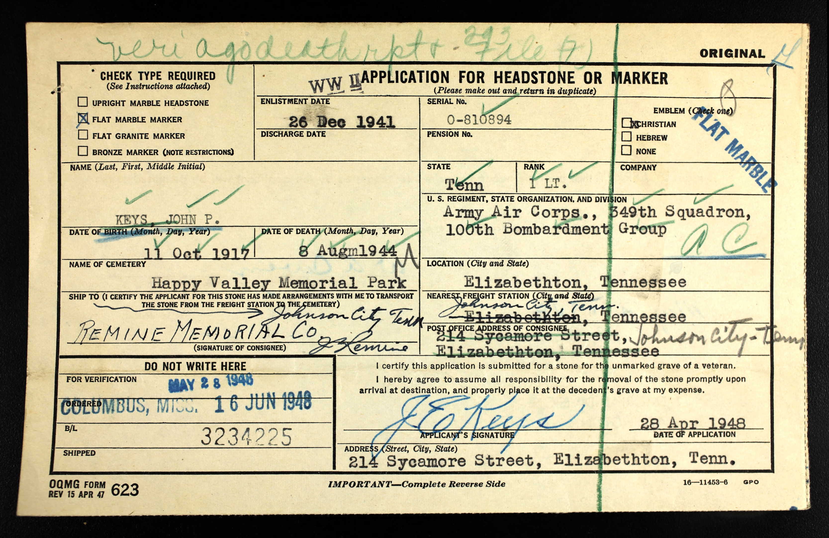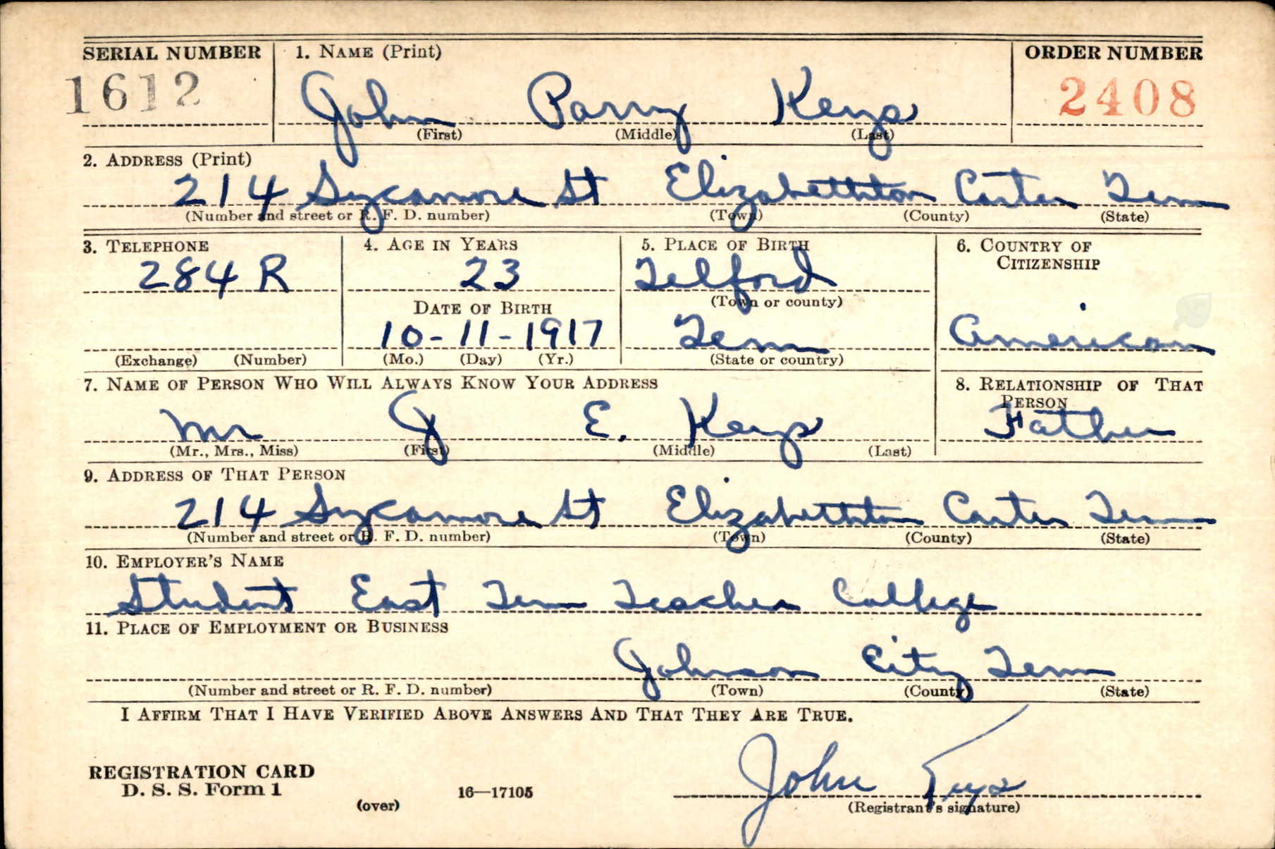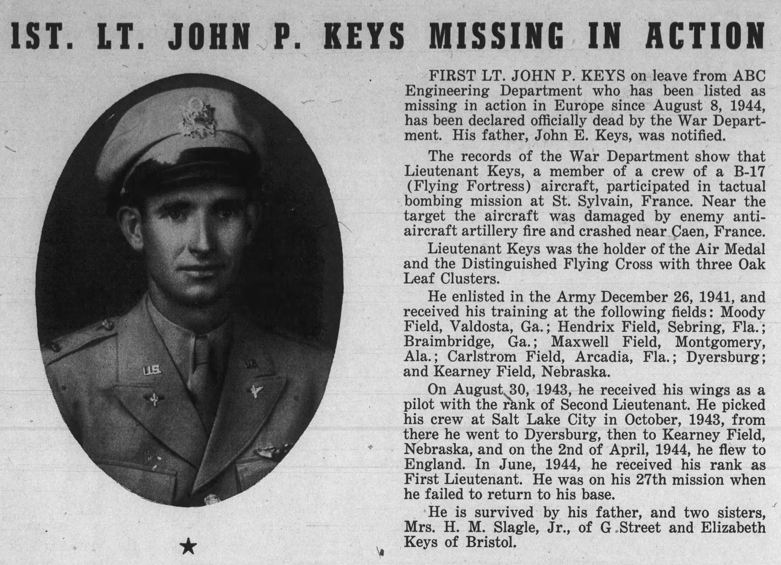 John Parry Keys was the son of John Edney Keys and Cleo Athena Parry. He graduated from Elizabethton High School in the class of 1937 and attended East Tennessee State College where he lacked about three months of graduating at the time he volunteered for service on December 26th, 1941.
