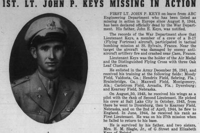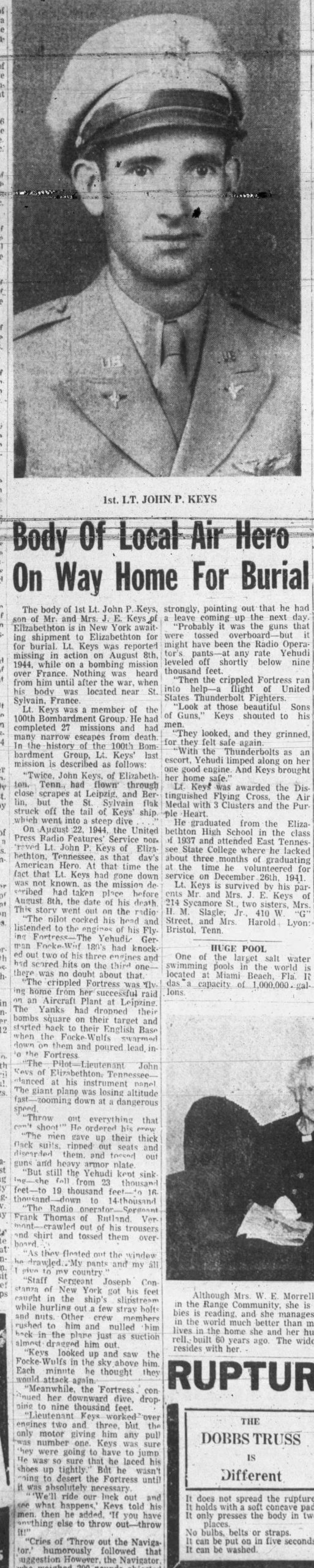 John Keys left Elizabethton shortly after the United States entered World War II. He, like millions of young Americans, joined the U.S. armed forces and journeyed to Europe, Africa and Asia to fight enemies on two fronts. And like so many of those young Americans, Keys never returned home. The pilot of a B-17 Flying Fortress with serial number 43-37865, Keys and seven members of his nine-member crew were killed in action after their aircraft was shot down during a bombing mission over occupied France near a small village called Perigny on Aug. 8, 1944. Now, 60 years later, the village has erected a memorial tribute to Keys and his air crew. Yann Thomas, a resident of Perigny, informed the Star of plans to memorialize Keys and the crew with a stone memorial on the 50th anniversary of their deaths on Aug. 8, 2004. Keys served as a pilot with the 100th Bomb Group, 349th Bomb Squadron crew flying a B-17 bomber nicknamed the “Varga Venus” (photo below) over occupied France and into Germany during 1944. Keys crew included flight officer and co-pilot, Elvin W. Samuelson on the bomber. The squadron included 2nd Lt. Patrick H. Lollis; 2nd Lt. Elton Dickens; Sgt. Frank O. Thomas; Sgt. Harry D. Park; Sgt. Peter P. Martin; Sgt. Gilbert A. Borba; Sgt. Joseph A. Costanza, and Sgt. Donald V. Rieger. Only waist gunner Borba survived after bailing out of the aircraft, and he was taken prisoner of war. Costanza was not on the flight. The Missing Air Crew report on the incident stated that Dickens bailed out but later died on the same day from a leg wound. The 100th Bomb Group of the U.S. Army Air became known as “The Bloody Hundredth”. Keys and his crew were on a bombing mission over occupied France near St. Sylvain when their plane was shot down near Perigny. According to the U.S. Army’s operations narrative of their mission, Keys’ B-17 was hit by flak in the number two engine roughly 90 seconds before unloading over an occupied area near Perigny. The village lies in the French province of Calvados – the historic province of Normandy – roughly 30 miles southwest of Caen. It is the province where U.S. military men hit the beaches of Normandy and Omaha on D-Day, June 6, 1944. Keys’ crew had a close call on returning to England from a bombing mission in late May. According to a United Press news report published June 2, 1944, the B-17 was “limping home” on one good and one disabled engine. Keys ordered the crew to “throw out everything that can’t shoot”, according to the report. The crew complied, tossing out all removable guns and ammunition as well as some of their clothing, according to the UP report. Thomas said he “threw out his pants, shirt and underwear, declaring, ‘My pants and my all, I give for my country.'” In 1943, the average life of an 8th Air Force B-17 crew was 11 missions. In 1943-1945, the 100th lost 177 aircraft missing in action plus 52 lost due to operational accidents, a total of 229. The 100th was not the Group with the highest losses in the 8th, but since its losses often came many at a time, it soon acquired the reputation of a hard-luck outfit and the name “The Bloody Hundredth.” John Perry Keys was the son of Mr. and Mrs. J.E Keys. A memorial service honoring Keys was held at the First Methodist Church in Elizabethton on April 25, 1948, according to county historical records. Beginning in May 1944, Keys and his crew flew bomb missions that struck munitions factories in Munich and Hamburg as well as oil refineries in Western Germany. They had flown 25 missions over enemy territory when they took off on Aug. 8, 1944, according to a flight history of the crew provided by the 100th Bomb Group Foundation’s Web site. The Foundation preserves the memories of veterans killed in missions over Europe during World War II. Costanza did not fly that mission. The memorial will have the names of all crew members engraved on a marble or bronze tablet and will be placed in front of the town hall of Perigny. World War II veteran and ex-prisoner of war, Wright Swanay, recalled meeting Keys while both were preparing to ship out to Europe. “I was in Salt Lake City, Utah in November 1943,” said Swanay. “John was a pilot, and we were being assigned to our crews. We never knew each other until then.” Swanay said once the men got their assignments, they shook hands and headed off. That was the last time he ever saw Keys. Swanay said Keys was one of three men he made a point to remember each Memorial Day as a veteran and fellow Elizabethtonian who answered the call to duty and gave his life for freedom. “I got shot down and they got shot down,” said Swanay, “and I was the one who came back.”