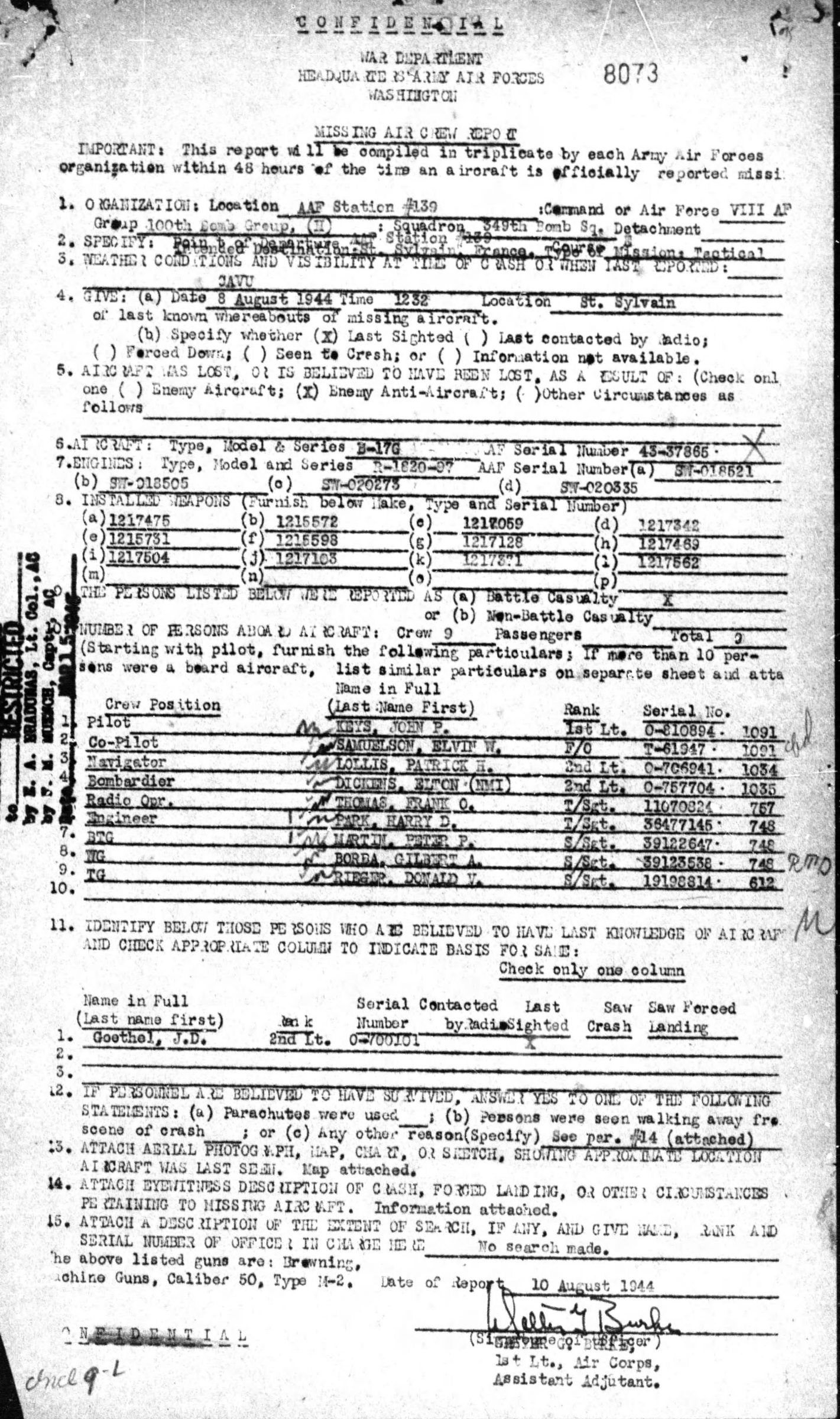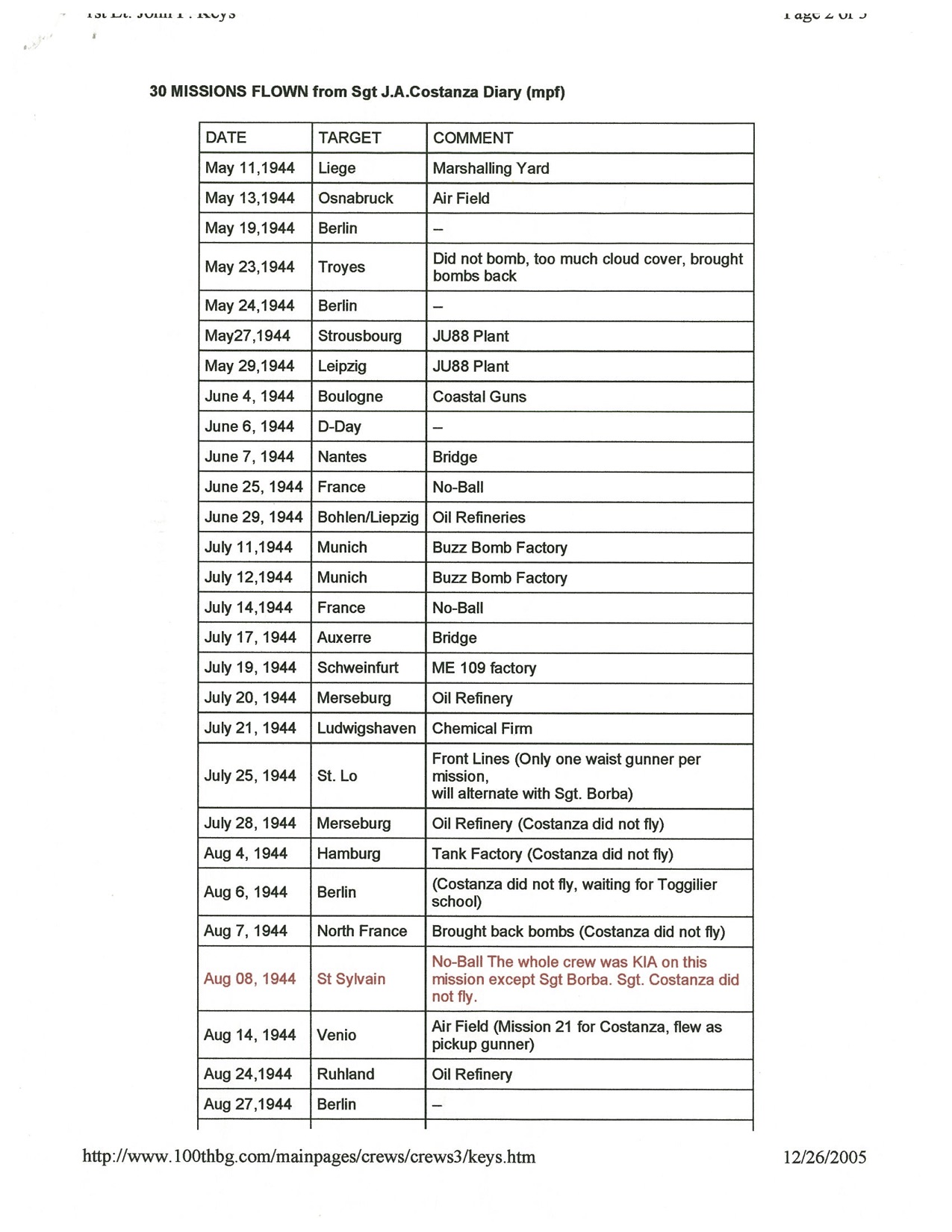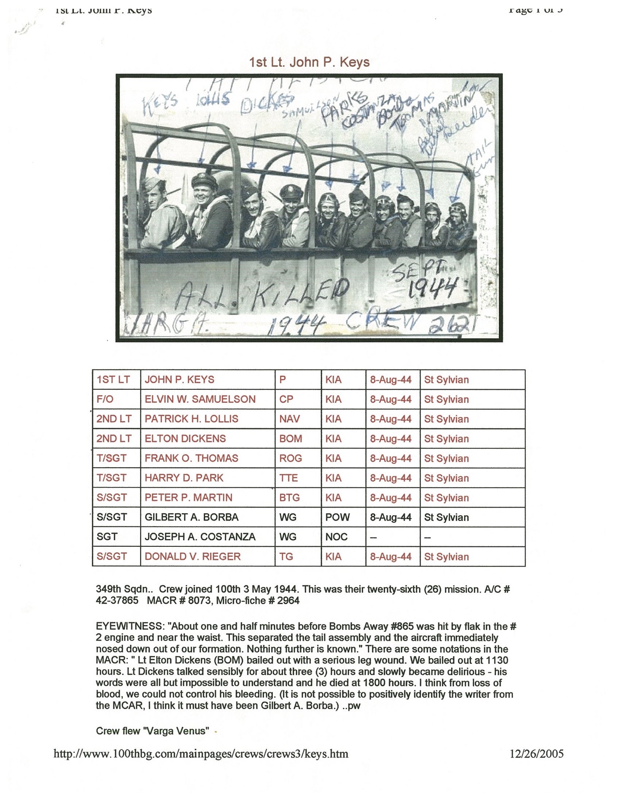 The crewmembers and hometowns listed at the 100th Bomb Groups Web site are: