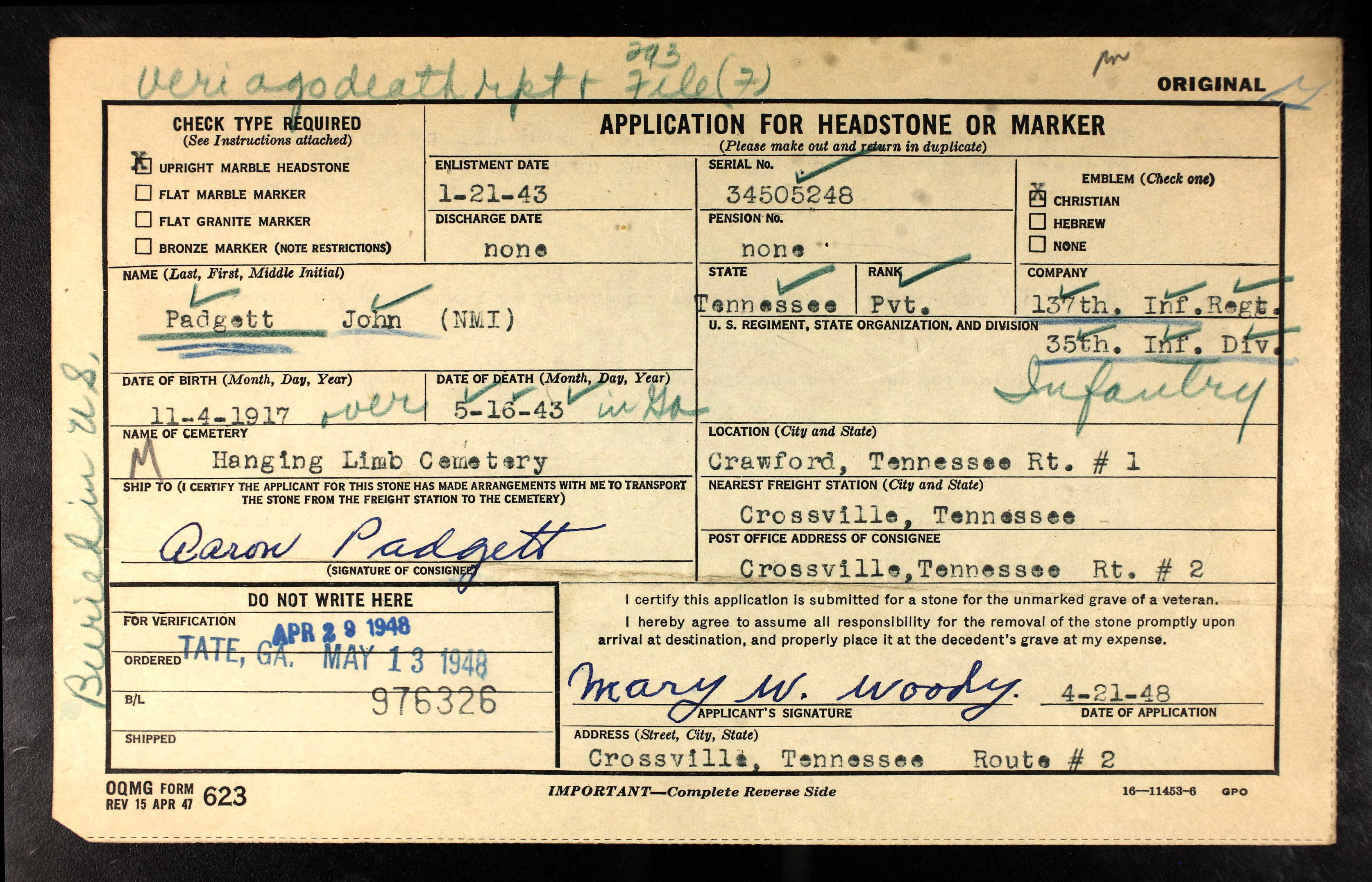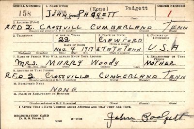 John Padgett was born on 4 November 1917 at Crawford, Tennessee, the son of Wilbert Padgett and Mary Lou Wyatt.