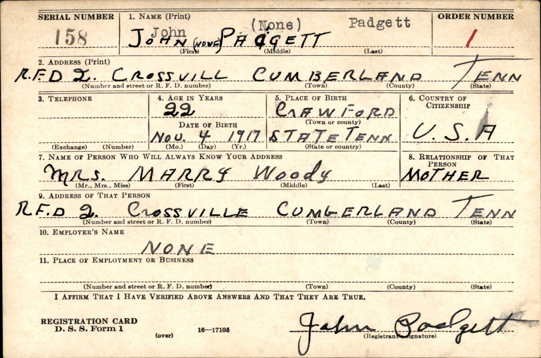 John Padgett was born on 4 November 1917 at Crawford, Tennessee, the son of Wilbert Padgett and Mary Lou Wyatt.