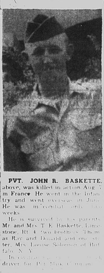 Pvt John R. Baskette was killed in action Aug. 7 in France. He went in the Infantry and went overseas in June. He was in combat only two weeks. He is survived by his parents, Mr. and Mrs. T.E. Baskette, Limestone, Rt. 4; two brother, Thomas Ray and Donald and one sister, Mrs. Louise Solomon of Buffalo, N.Y.