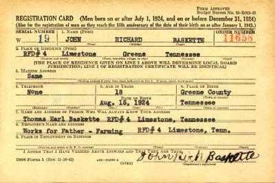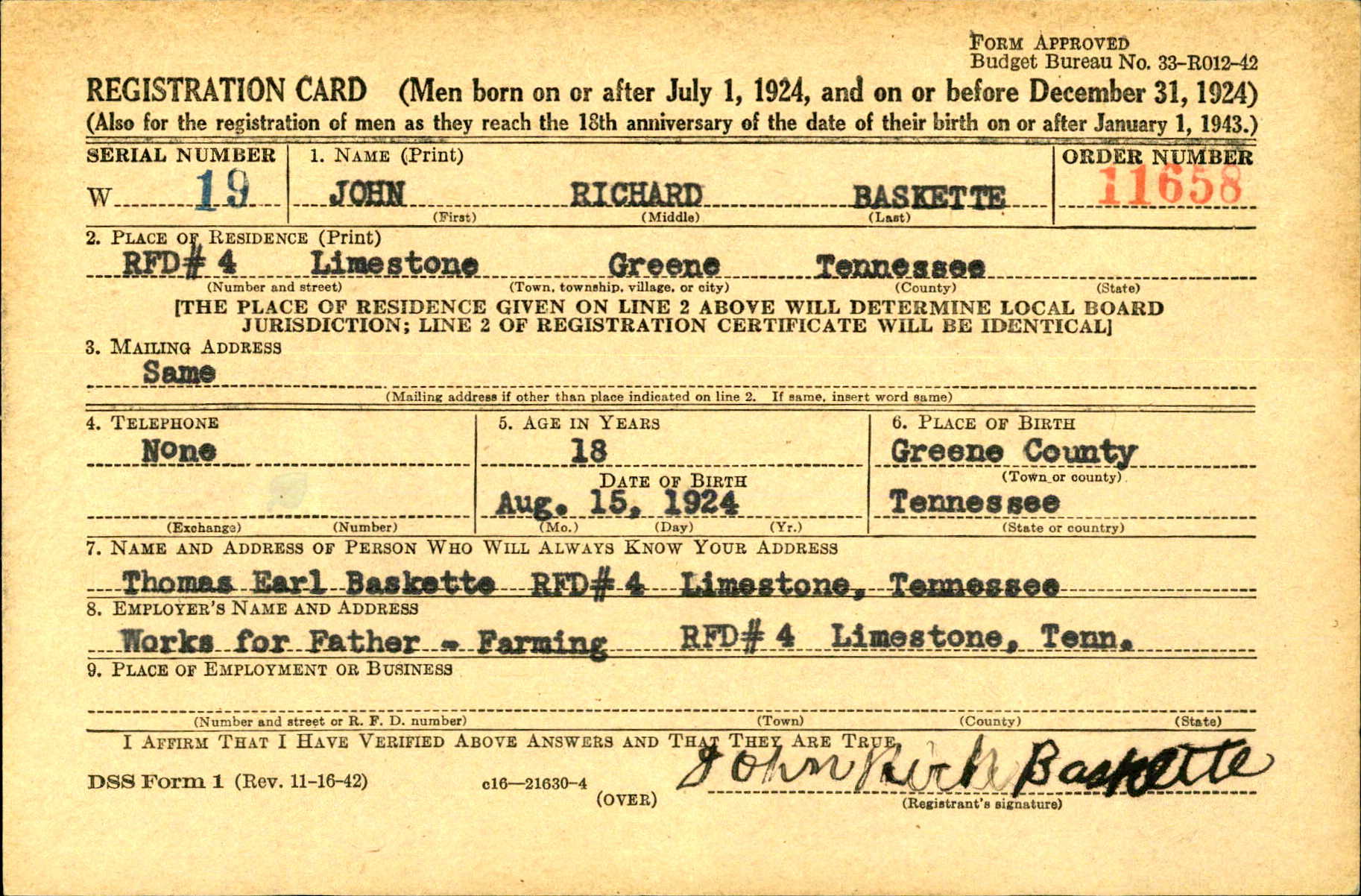 John Richard Baskette was born at Limestone, Tennessee, the son of Thomas Earl Baskette and Roda Carder.