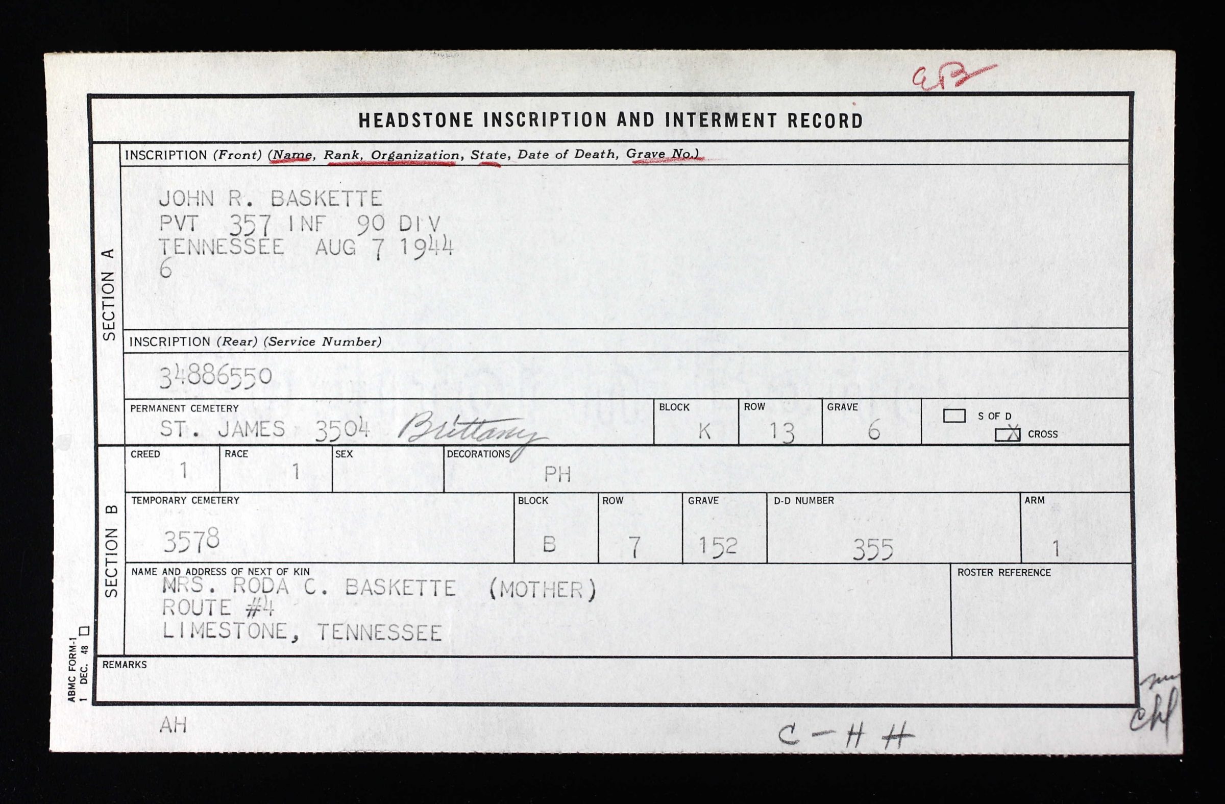 Private John Richard Baskette was assigned to the 357th Infantry Regiment, 90th Division. The Division was involved with fighting in the Normandy region. He died on 7 August 1944 and is interred at K,13,6 Brittany American Cemetery, St James, France.