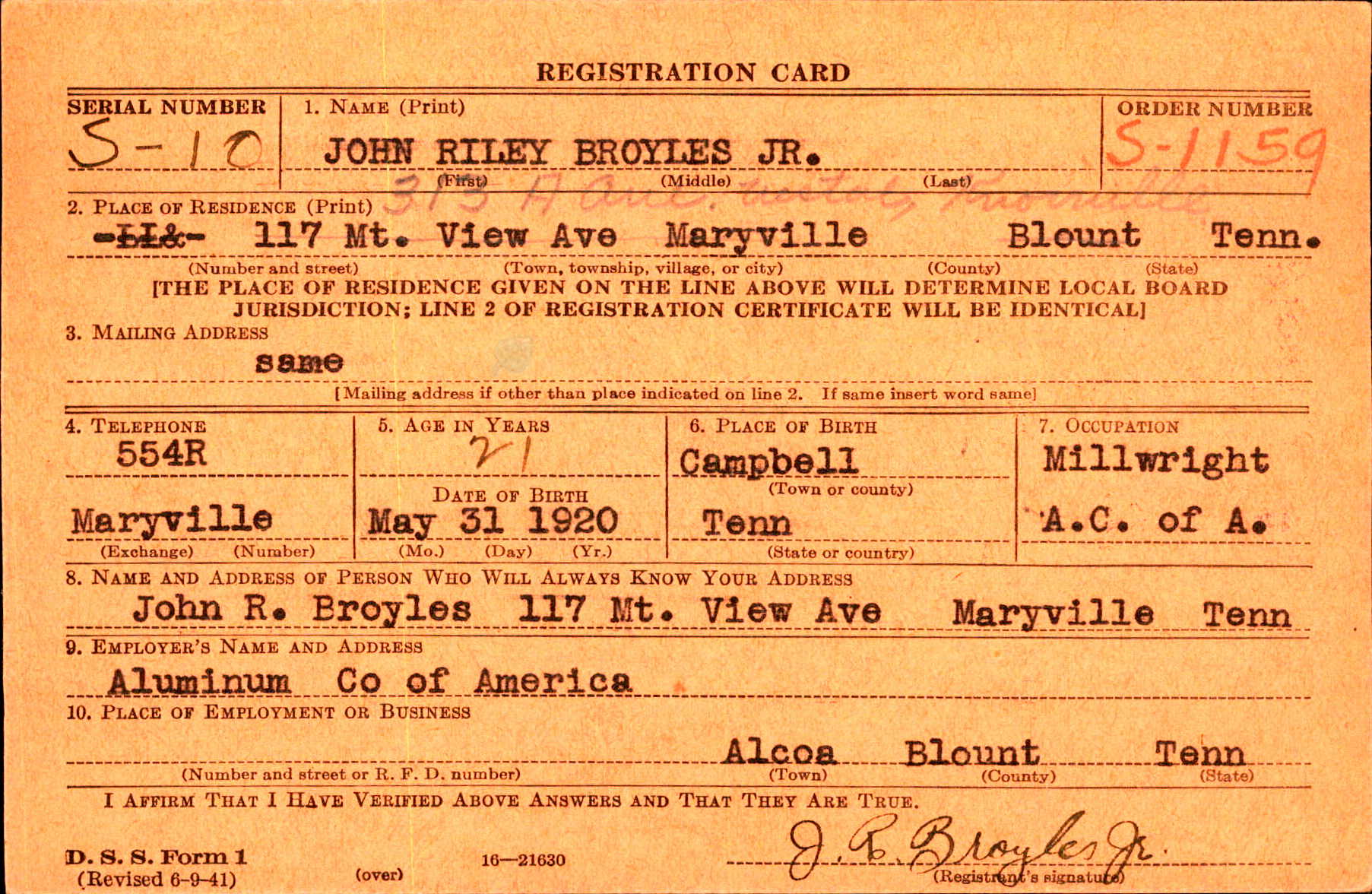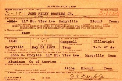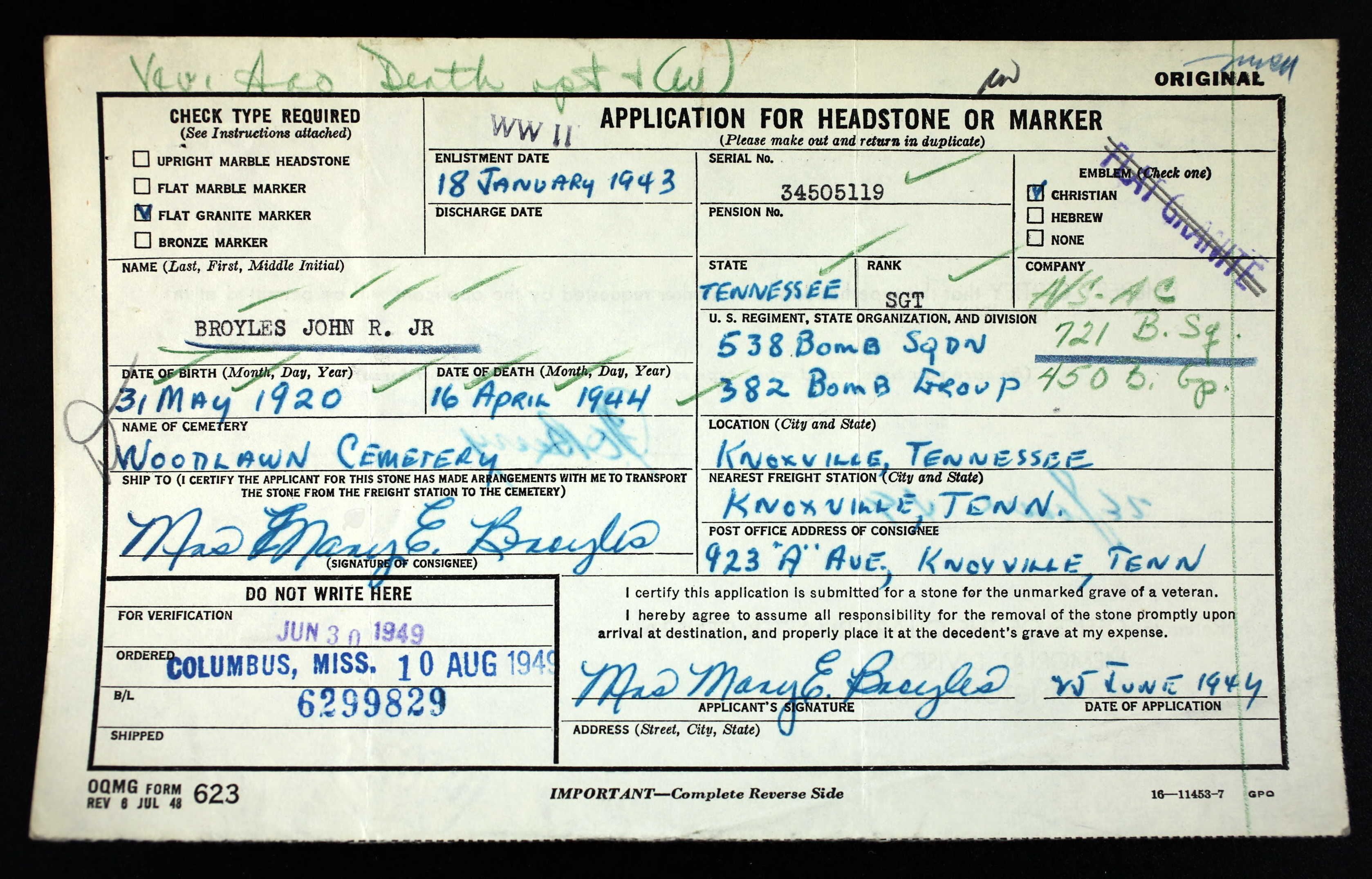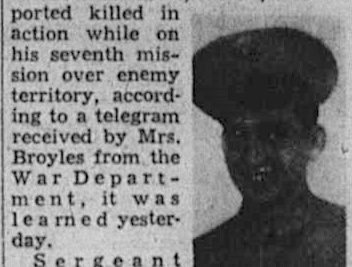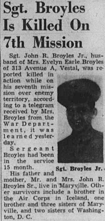 Sgt. John R. Broyles, Jr., husband of Mrs. Evelyn Earle Broyles of 313 Avenue A, Vestal, was reported killed in action while on his seventh mission over enemy territory, according to a telegram received by Mrs. Broyles from the War Department, it was learned yesterday. Sergeant Broyles had been in the service 15 months. His father and mother, Mr. and Mrs. John R. Broyles, Sr., live in Maryville. Other survivors include a brother in the Air Corps in Iceland, one brother and three sisters of Maryville and two sisters of Washington, D.C.