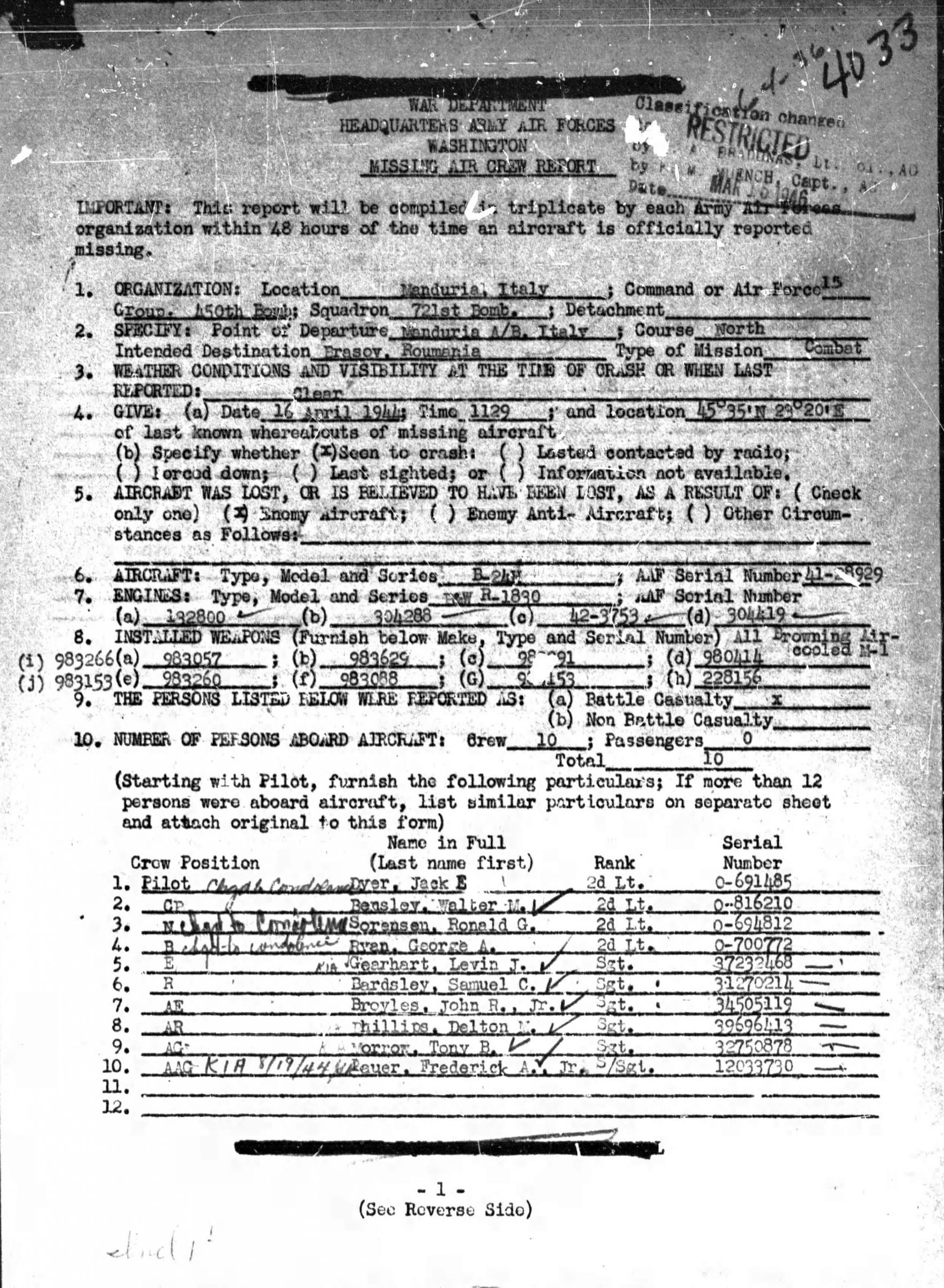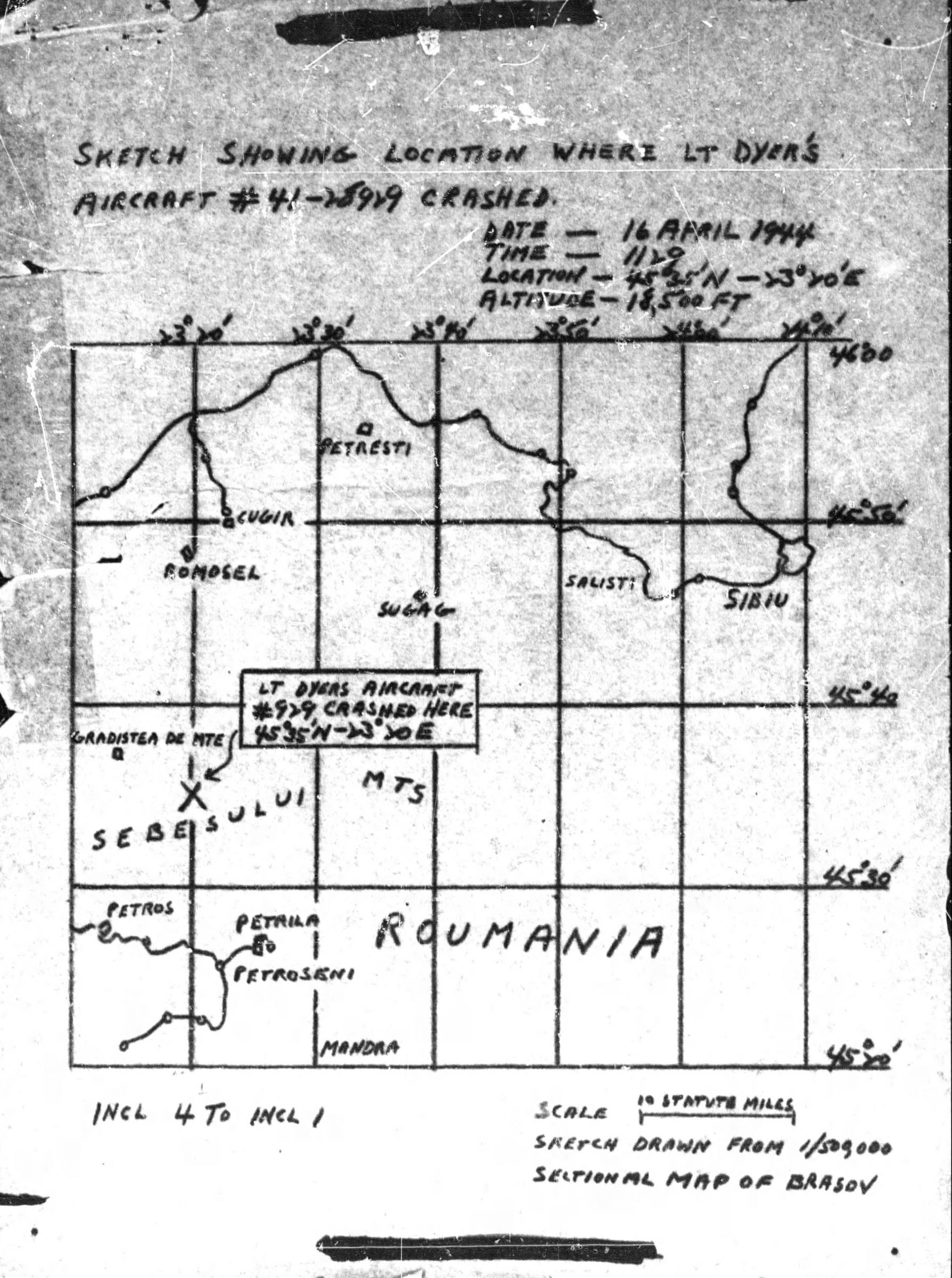Statement from S/Sgt Alexander Witkowski Jr: On 16 April 1944, our group was on a mission to bomb the target at Brasoy, Roumania. I was flying as tail gunner in ship #085 in the right element of the First attack unit. Soon after leaving the target area, we were attacked by enemy fighters. A short while later I saw a B-24 leave its formation position in the second attack unit of the right element. I saw eight bail out at regular interval. I lost sight of the ship as it passed my line of vision. According to the Group Operations´ diagram, this aircraft was #41-28929 flown by Lieutenant Dyer. I last saw the ship at an altitude of 19,000 feet. The navigator´s coordinates were 4515N-2420E. The time was about 1118.