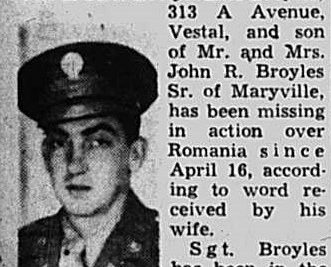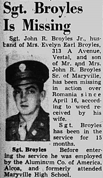 Sgt. John R. Broyles, Jr., husband of Mrs. Evelyn Earl Broyles, 313 A Avenue, Vestal, and son of Mr. and Mrs. John R. Broyles Sr. of Maryville, has been missing in action over Romania since April 16, according to word received by his wife. Sgt. Broyles has been in the service for 15 months. Before entering the service he was employed by the Aluminum Co. of America, Alcoa, and formerly attended Maryville High School.