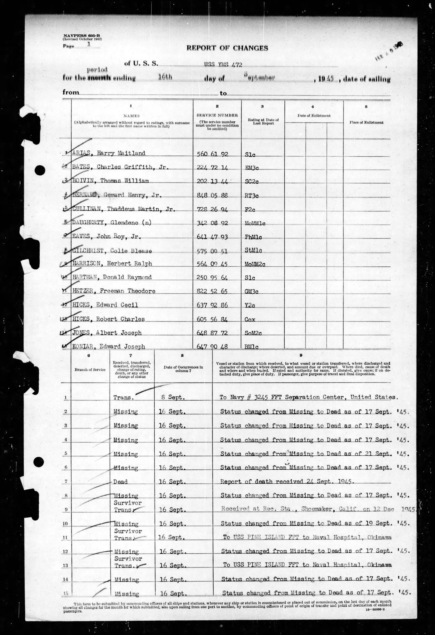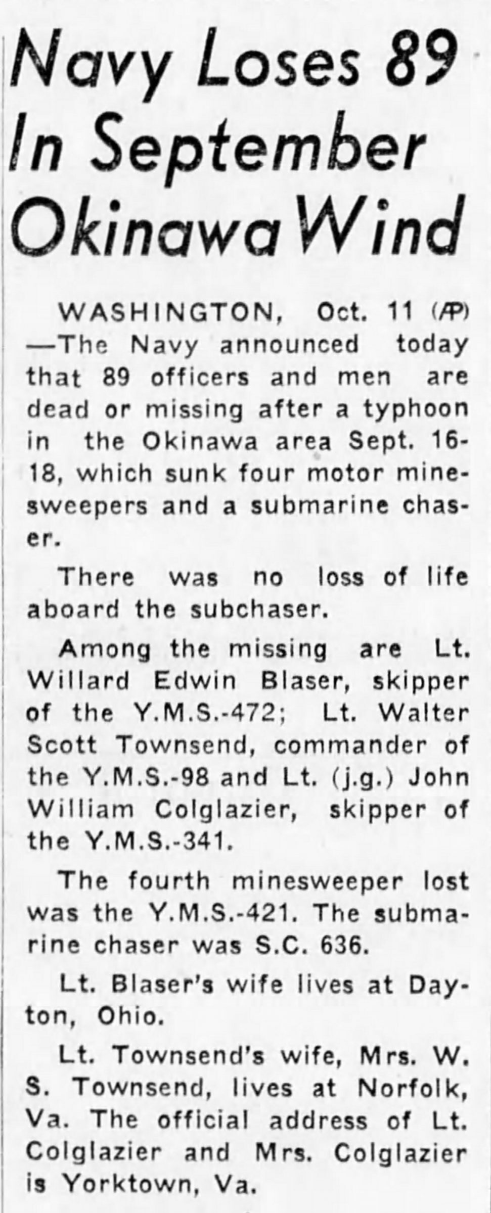 The USS YMS 472, was sunk in a typhoon in the Pacific. At 2040 YMS 434 reported that he could not contact YMS 472. His last radio contact was between 1600 and 1700. The last know position of UMS 472 at approximately 1530, 16 September – bearing 085 (T) from Northern tip of Okinawa, distance 12 Miles.