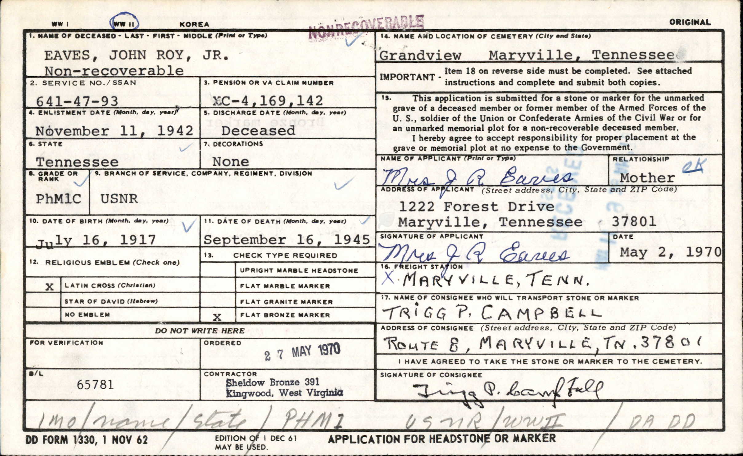 John Roy Eaves Jr. was the son of John Roy Eaves and Daisy Lee Morton.