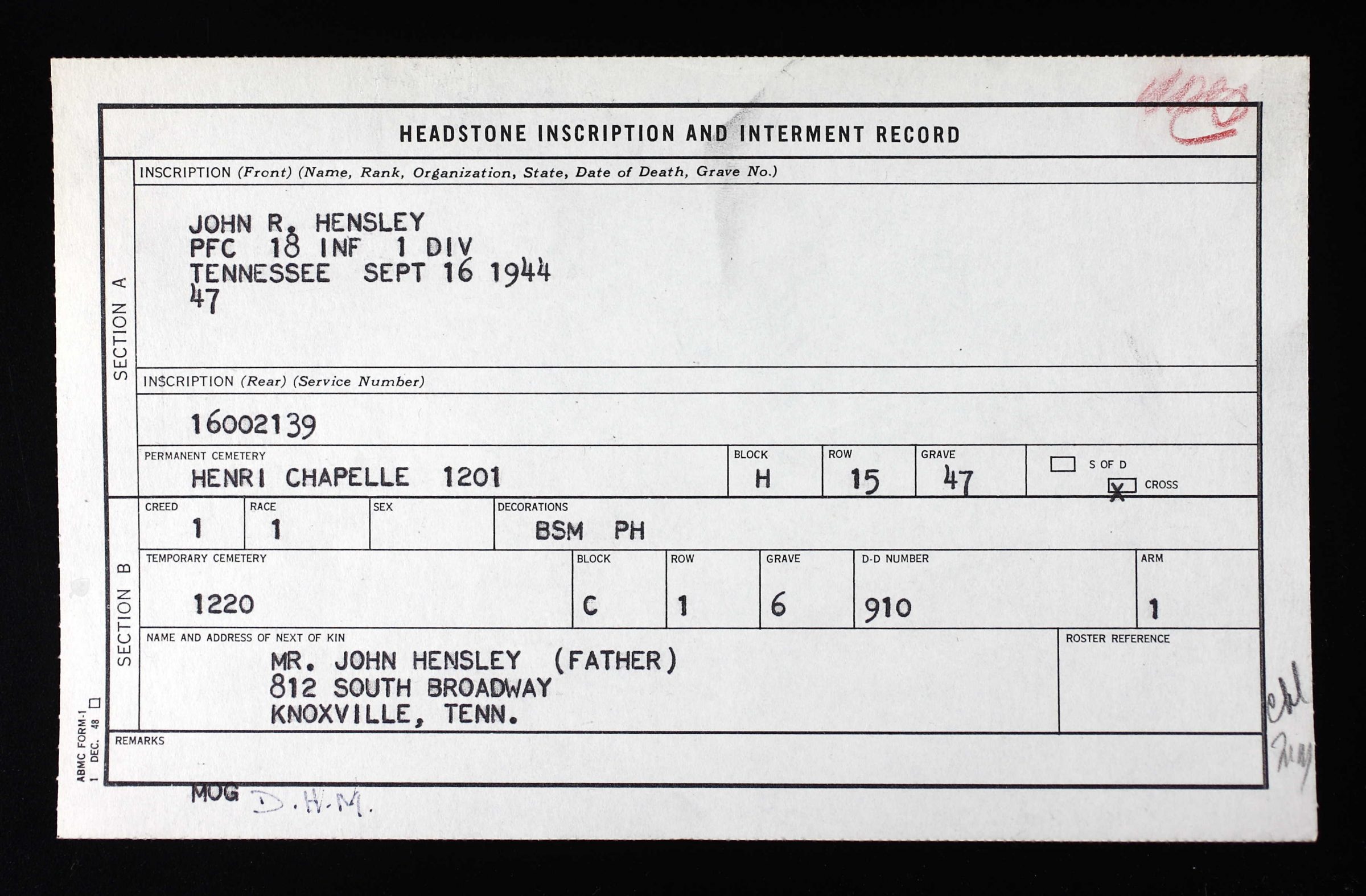 - Burial/Memorial Location: Henri-Chapelle American Cemetery, Henri-Chapelle, Belgium