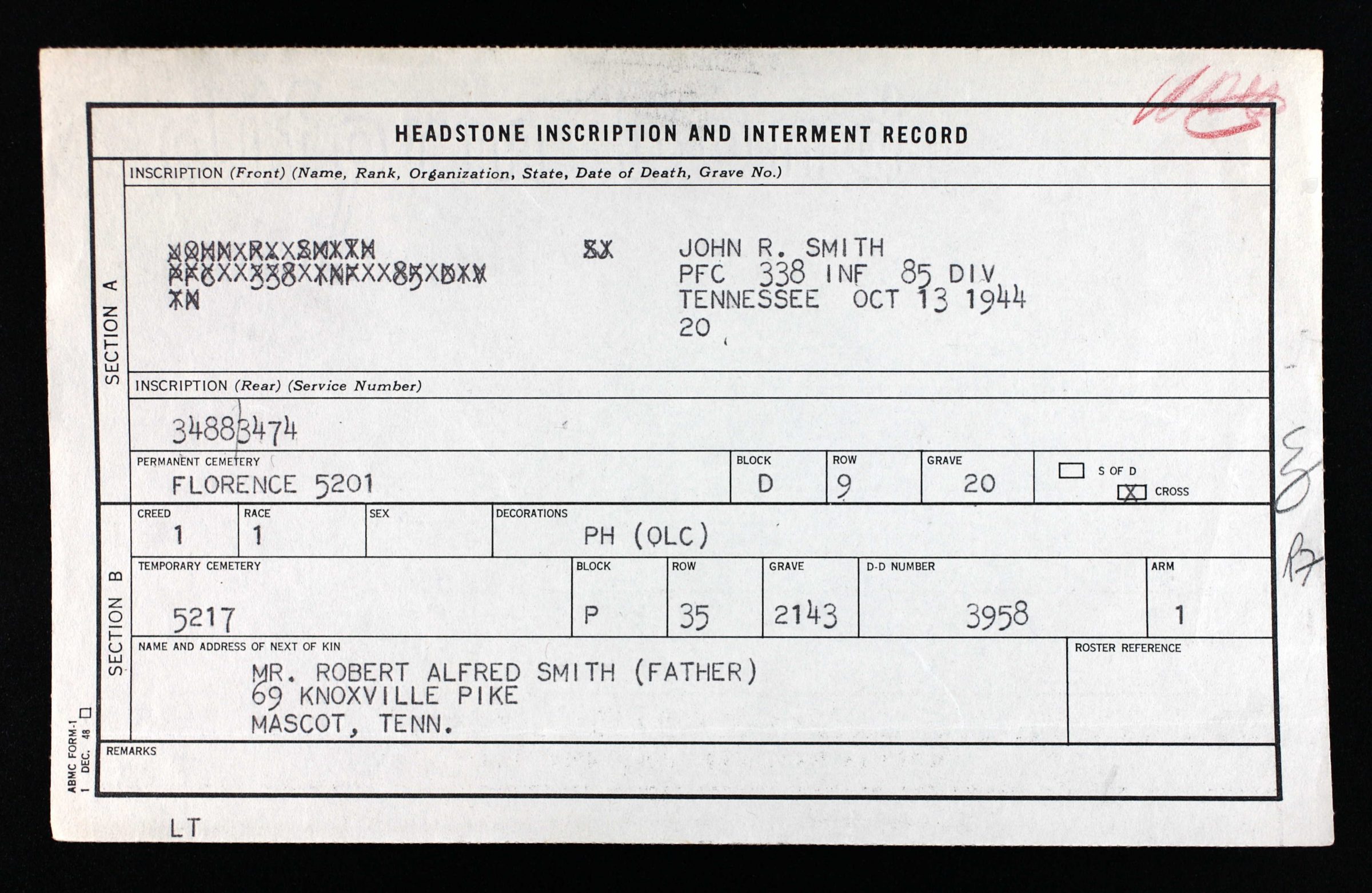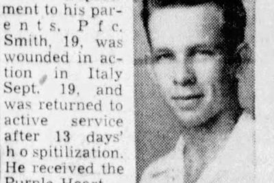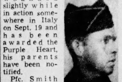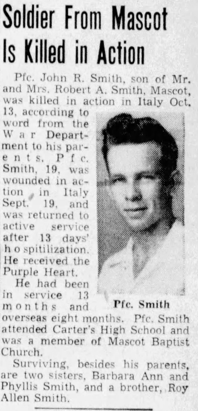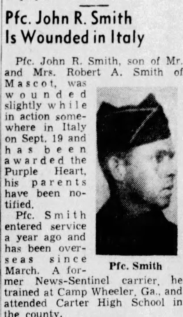 Pfc. John R. Smith, son of Mr. and Mrs. Robert A. Smith of Mascot, was wounded slightly while in action somewhere in Italy on Sept. 19 and has been awarded the Purple Heart, his parents have been notified. Pfc. Smith entered service a year ago and has been overseas since March. A former News-Sentinel carrier, he trained at Camp Wheeler, Ga., and attended Carter High School in the county.