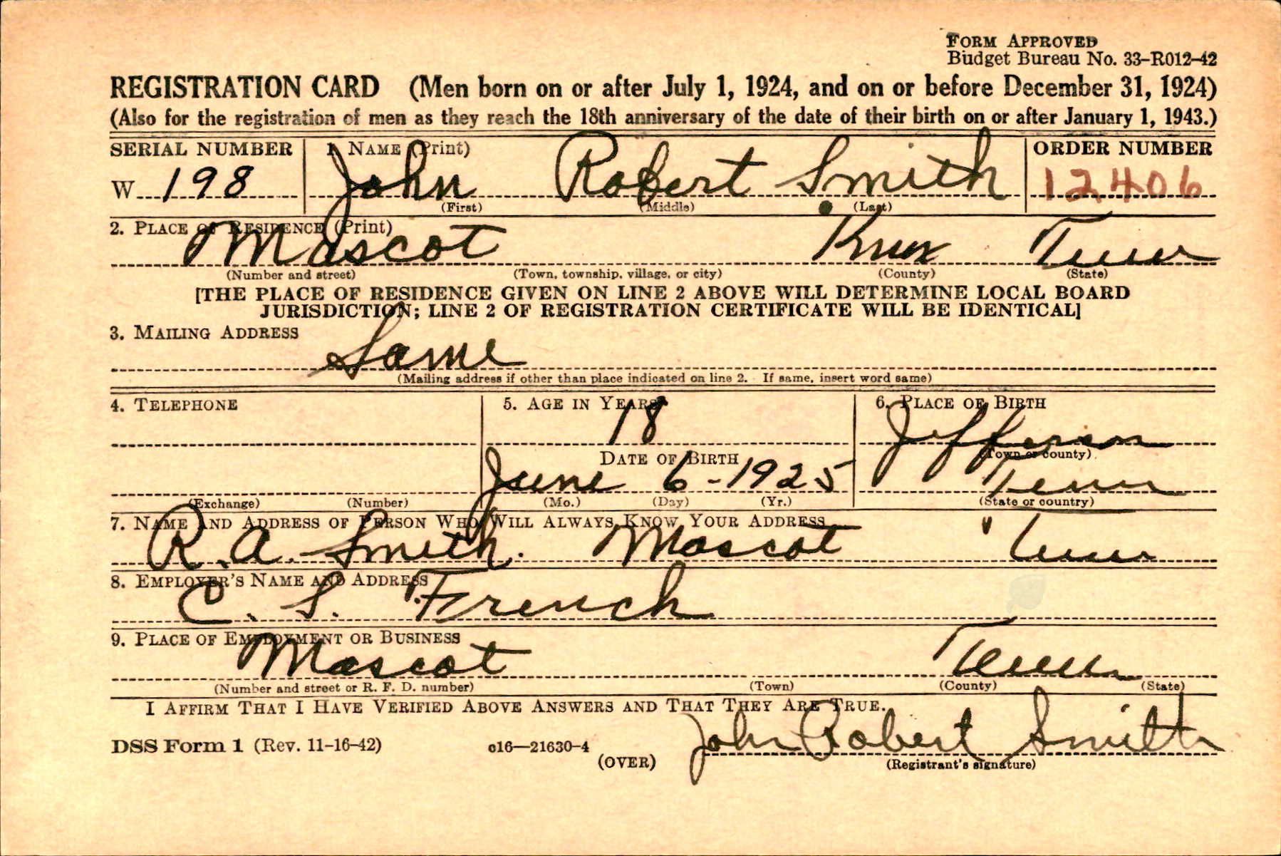 John Robert Smith was born in Jefferson, Tennessee, the son of Robert Albert Smith and Pearl Elizabeth Lane.