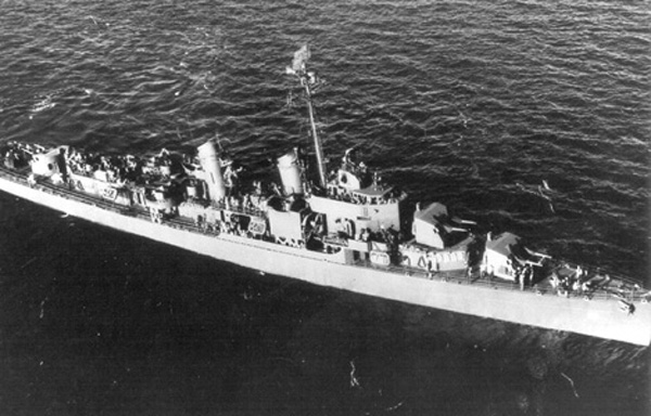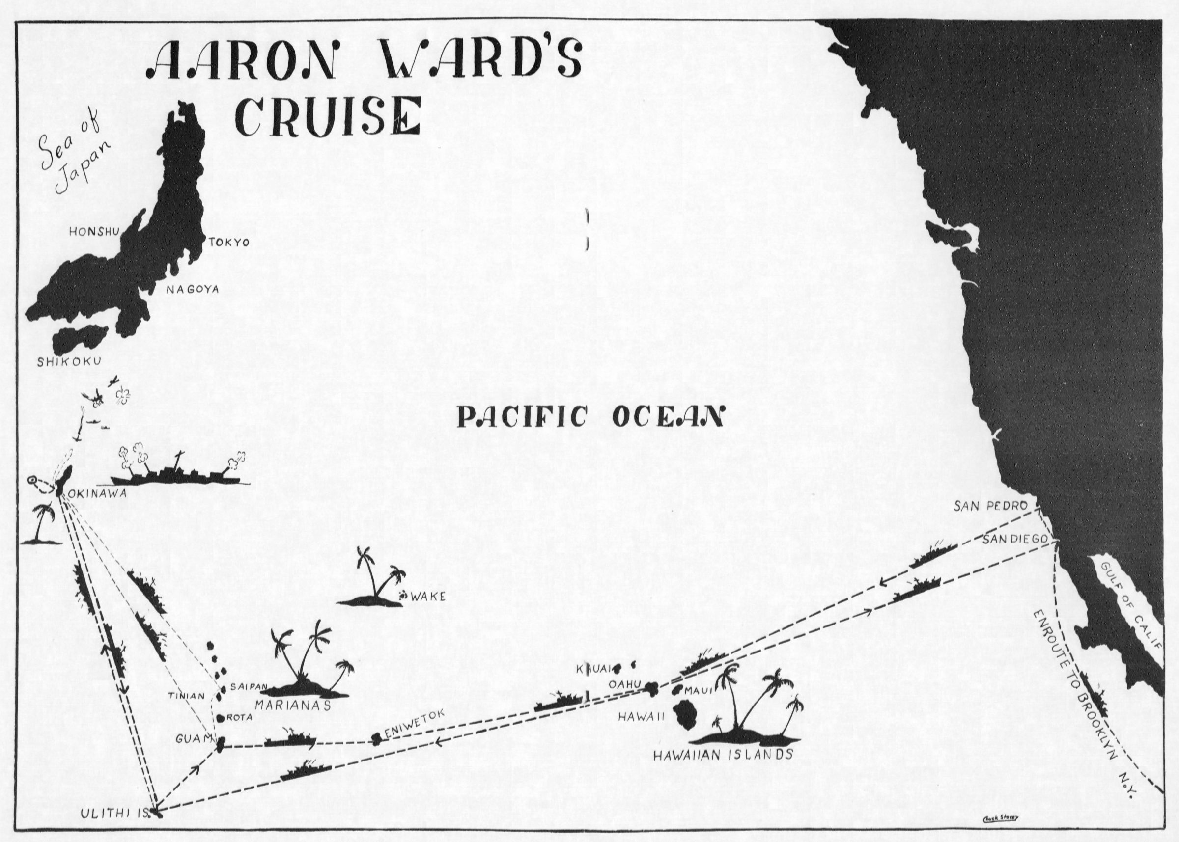 But the Aaron Ward never stopped fighting. Impenetrable smoke poured from the pierced stack, masking Japanese suicide planes as they made their runs, but Aaron Ward’s guns kept blazing. Five Kamakazes were blasted into the sea before they reached their targets. Five others that crashed on the Aaron Ward were hit hard during their runs. But these five Japanese planes – and one more which sneaked in undetected – hit their mark in one of the most intense and carefully co-ordinated mass suicide attacks on record.