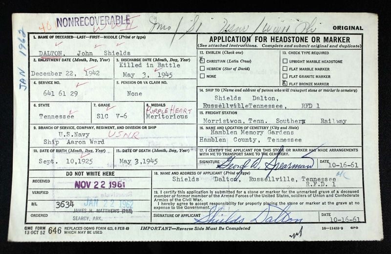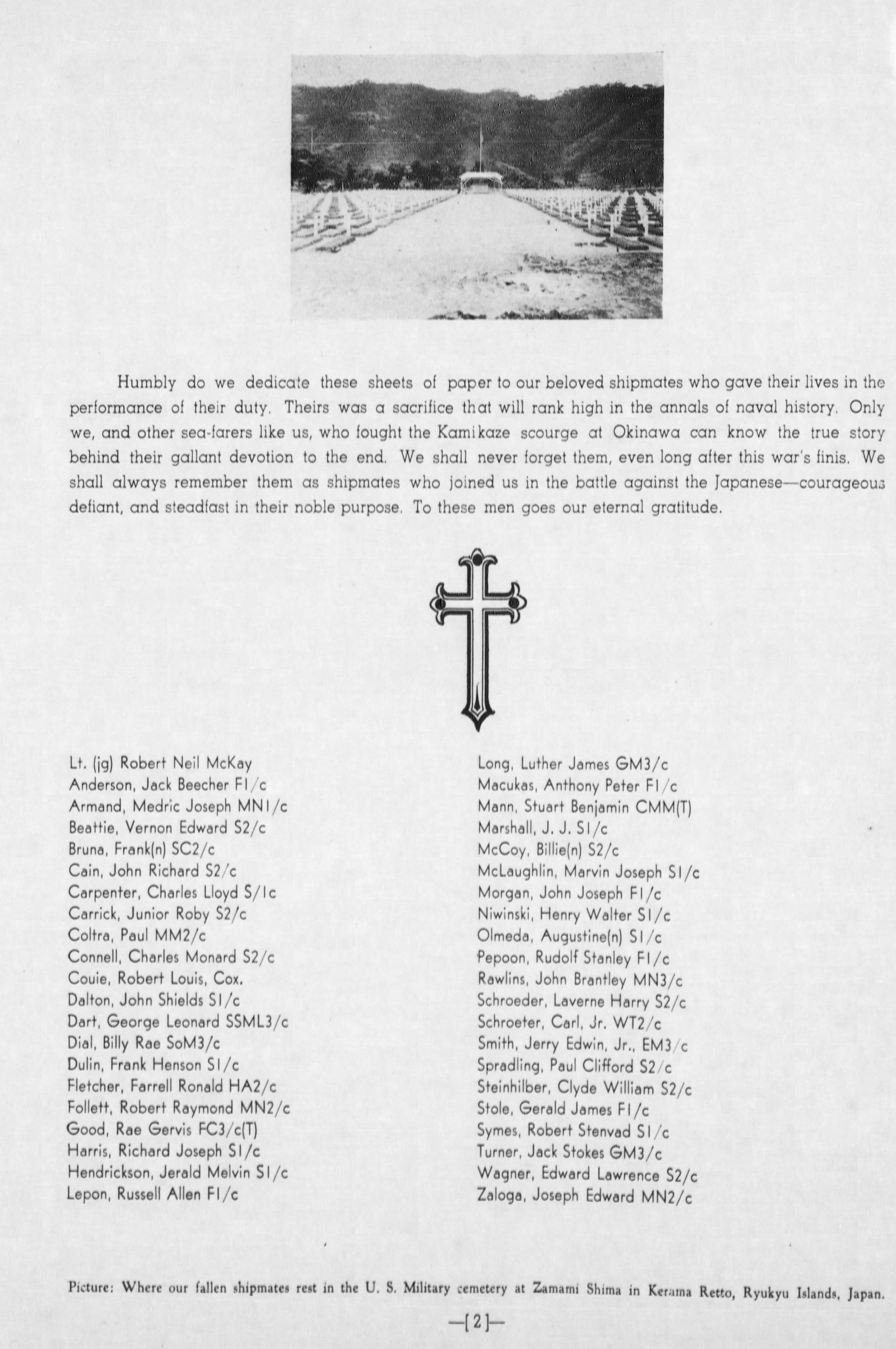 Died 3 May 1945, at Sea while on the on the U.S.S. Aaron Ward (DM34), near Sulawesi Tengah, Indonesia