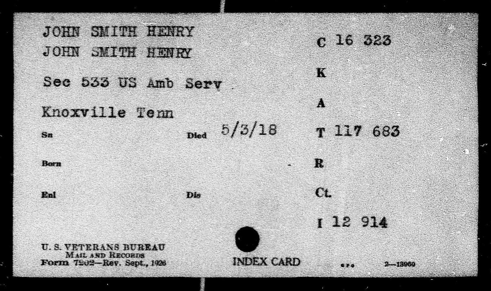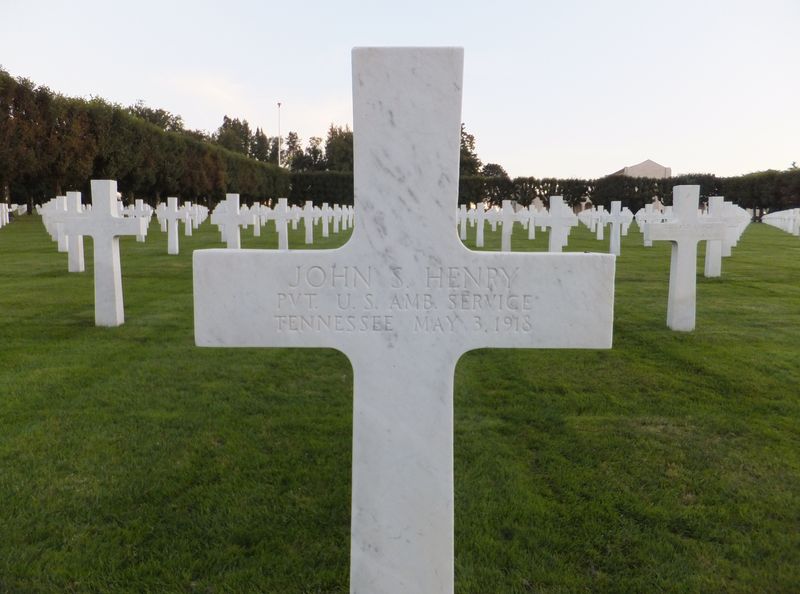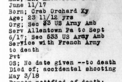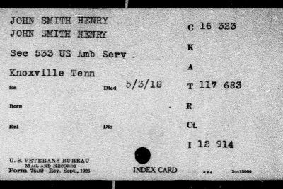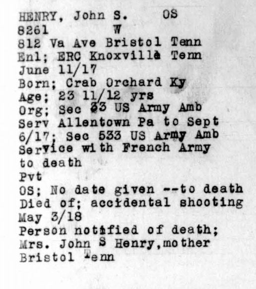 John Smith Henry Jr. was born 31 July 1893 in Kentucky. He enlisted June 8, 1917 in the University of Tennessee Ambulance Unit, later known as Ambulance Co. No. 533. Trained at Allentown, PA, and sailed to France in December 1917. His company was assigned for duty to the 30th French Division. Met his death May 3, 1918, after an accidental shooting.