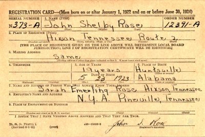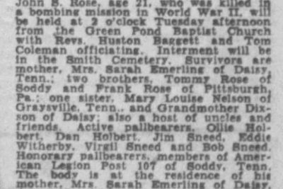 S/Sgt John S. Rose, son of Mrs. Sarah R. Emerling, Hixson, Route 2 was listed killed in action. Sgt Rose enlisted in the air corps in November, 1942 and went overseas in Novemer, 1943. He was previously reported missing in action since April 19, and the War Department informed his mother Aug. 7, that Sgt. Rose was killed in action on April 19. The Air Medal for meritorious achievement in aerial combat against the enemy was awarded to Sgt. Rose, who was 21 years of age. He has three brothers, Thomas Rose, U.S. Army, who is now spending a furlough at home; Hillery Franklin Rose, Pittsburgh, Pa., and Lee Roy Rose, Soddy; one sister, Mary Smith of Jasper, Tenn., and grandmother, Mrs. Jerusha Dixon of Daisy.