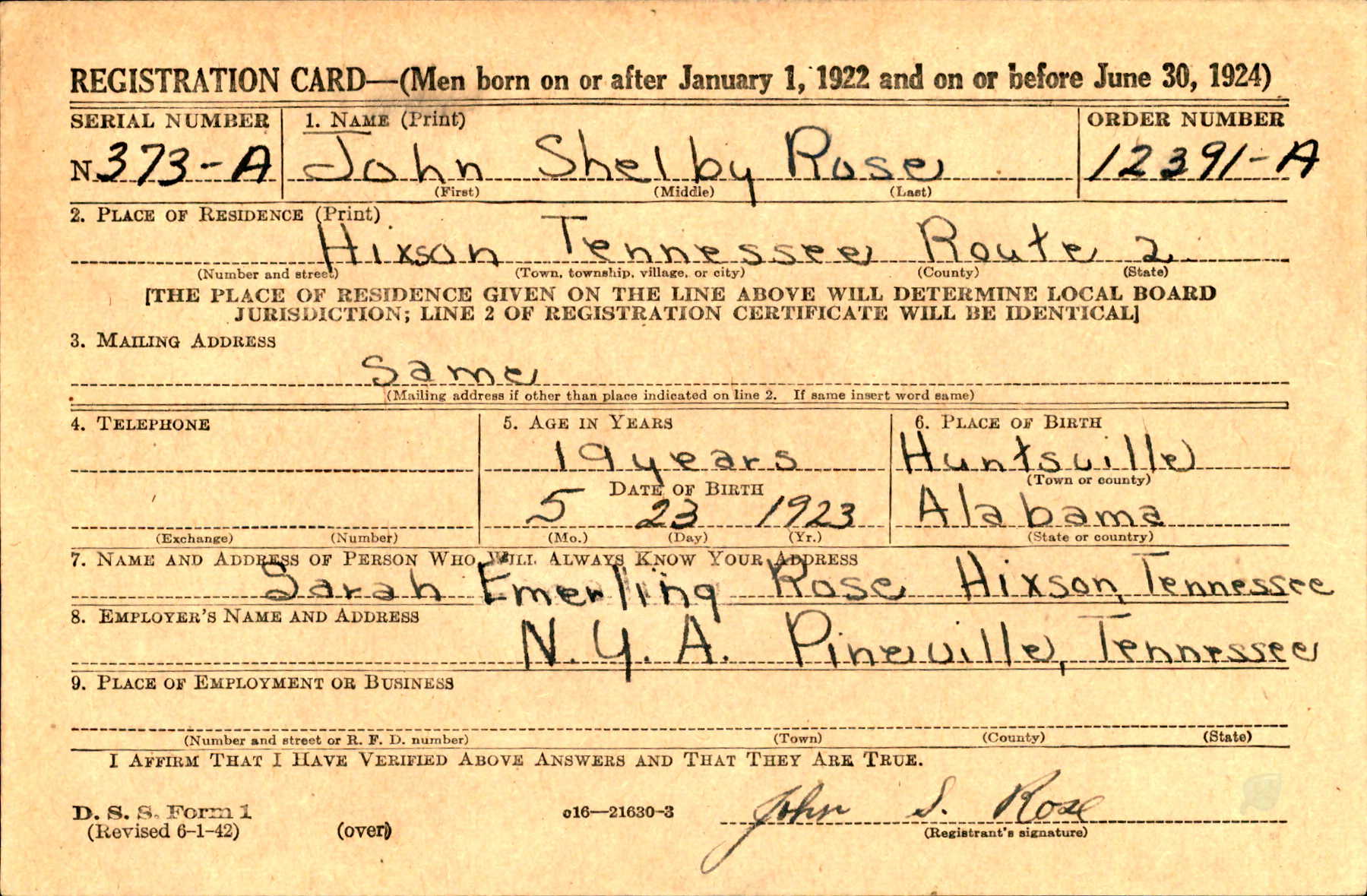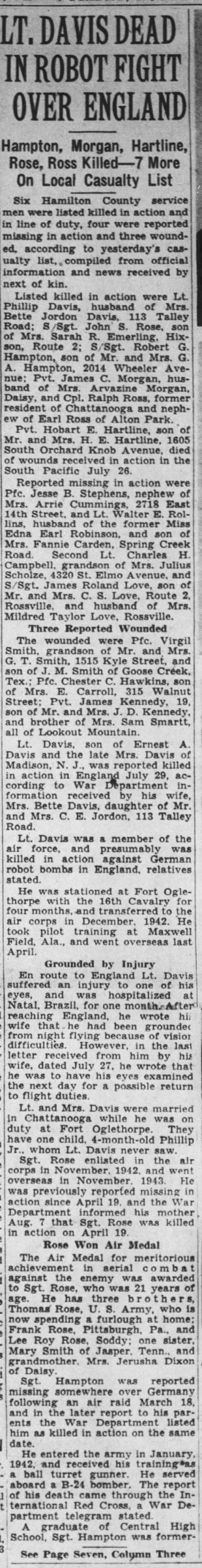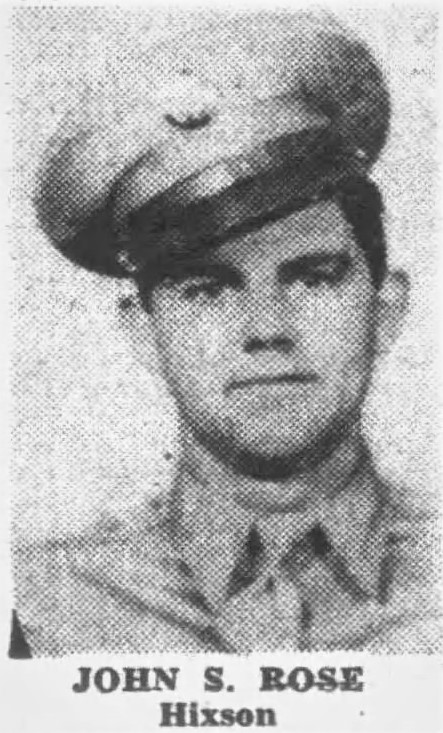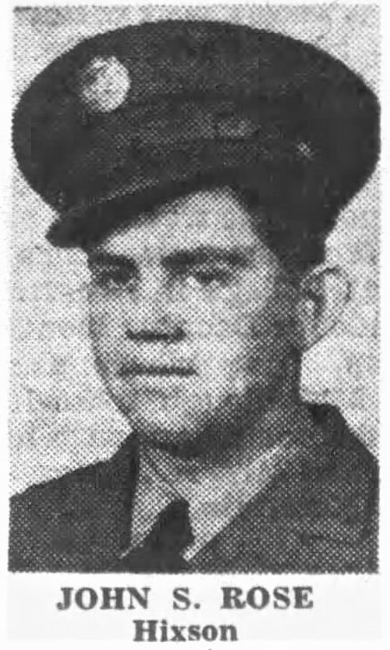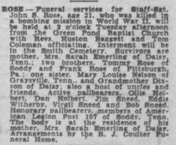 S/Sgt John S. Rose, son of Mrs. Sarah R. Emerling, Hixson, Route 2 was listed killed in action. Sgt Rose enlisted in the air corps in November, 1942 and went overseas in Novemer, 1943. He was previously reported missing in action since April 19, and the War Department informed his mother Aug. 7, that Sgt. Rose was killed in action on April 19. The Air Medal for meritorious achievement in aerial combat against the enemy was awarded to Sgt. Rose, who was 21 years of age. He has three brothers, Thomas Rose, U.S. Army, who is now spending a furlough at home; Hillery Franklin Rose, Pittsburgh, Pa., and Lee Roy Rose, Soddy; one sister, Mary Smith of Jasper, Tenn., and grandmother, Mrs. Jerusha Dixon of Daisy.