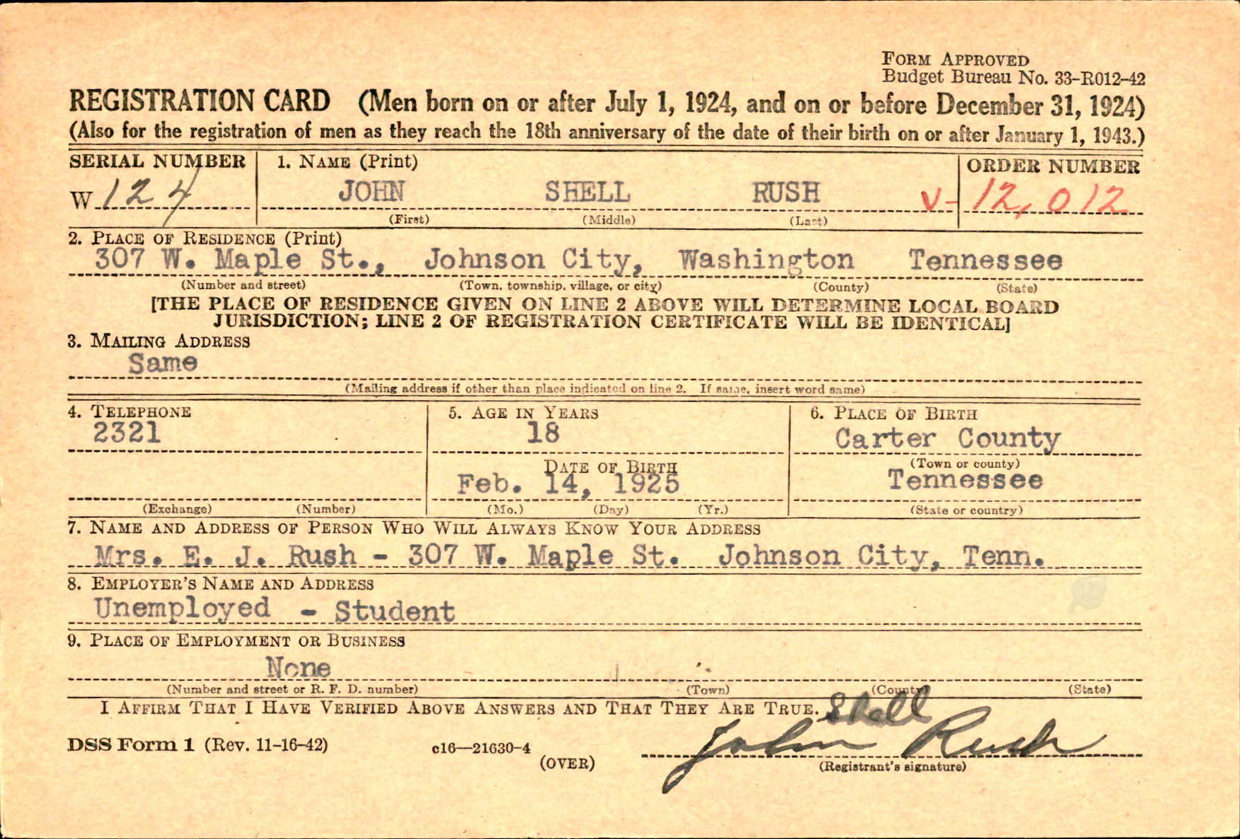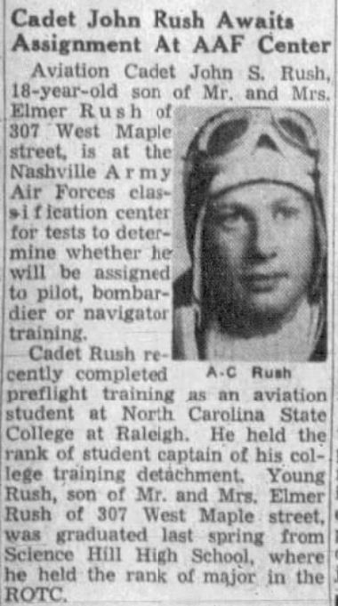 Aviation Cadet John Shell ‘Johnny’ Rush was the son of Elmer Joe Rush and Bertha Ann Shell. He was graduated from Science Hill High School in 1943 and  had preflight training at North Carolina State College at Raleigh. He completed the first phase of his flight training at the 2153rd AAF Base Unit at Woodward Field in Camden, S.C. in August, 1944 and was then assigned to the basic training flying school in the AAF Eastern Flying Training Command.